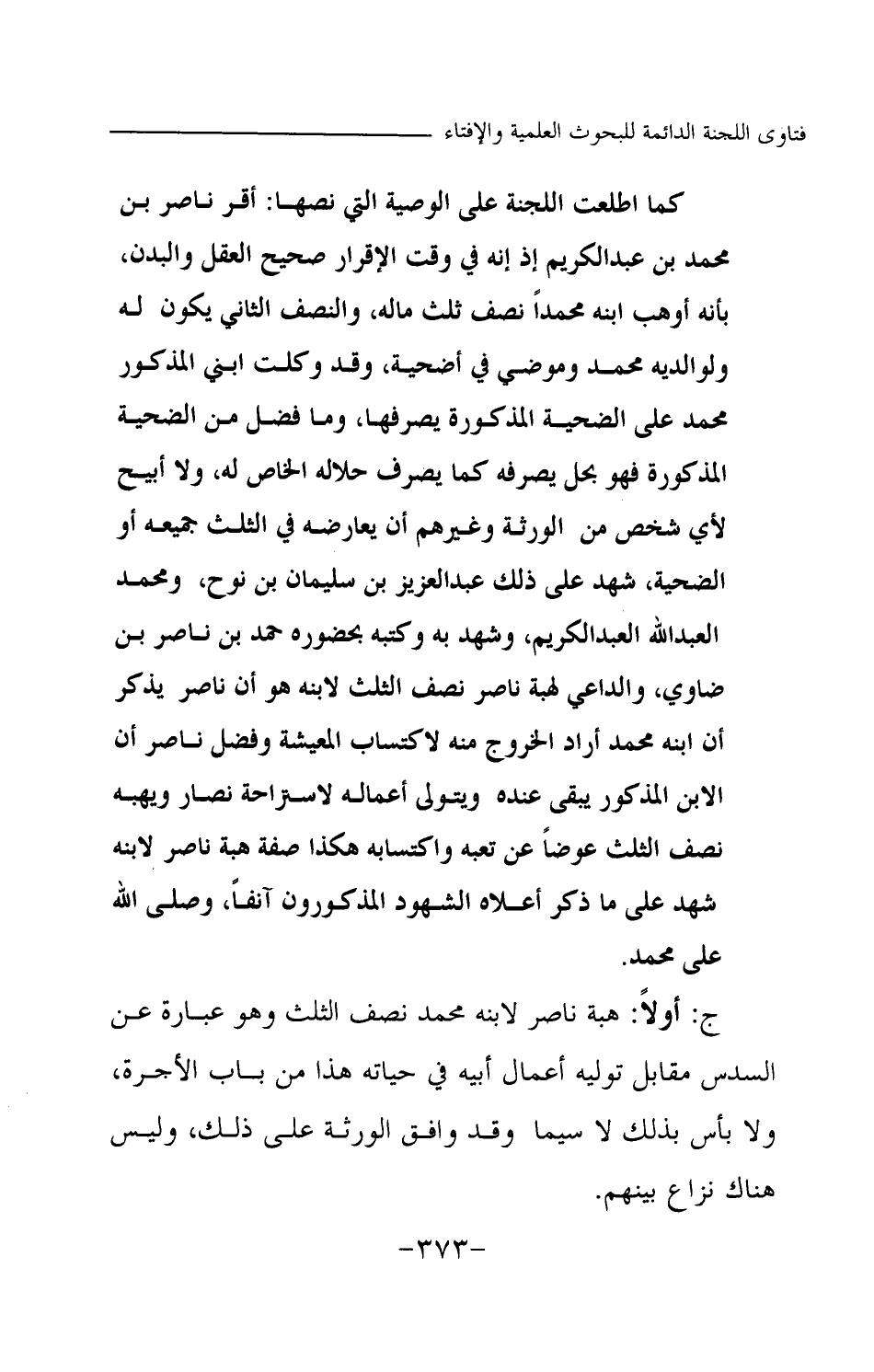 كما اطلعت اللجنة على الوصية التي نصها: أقر ناصر بن محمد بن عبد الكريم إذ إنه في وقت الإقرار صحيح العقل والبدن، بأنه أوهب ابنه محمدا نصف ثلث ماله، والنصف الثاني يكون له ولوالديه محمد وموضي في أضحية، وقد وكلت ابني المذكور محمدا على الضحية المذكورة يصرفها، وما فضل من الضحية المذكورة فهو بحل يصرفه كما يصرف حلاله الخاص له، ولا أبيح لأي شخص من الورثة وغيرهم أن يعارضه في الثلث جميعه أو الضحية، شهد على ذلك عبد العزيز بن سليمان بن نوح، ومحمد العبد الله العبد الكريم، وشهد به وكتبه بحضوره حمد بن ناصر بن ضاوي، والداعي لهبة ناصر نصف الثلث لابنه هو أن ناصر يذكر أن ابنه محمدا أراد الخروج منه لاكتساب المعيشة، وفضل ناصر أن الابن المذكور يبقى عنده ويتولى أعماله لاستراحة نصار ويهبه نصف الثلث عوضا عن تعبه واكتسابه هكذا صفة هبة ناصر لابنه شهد على ما ذكر أعلاه الشهود المذكورون آنفا، وصلى الله على محمد.