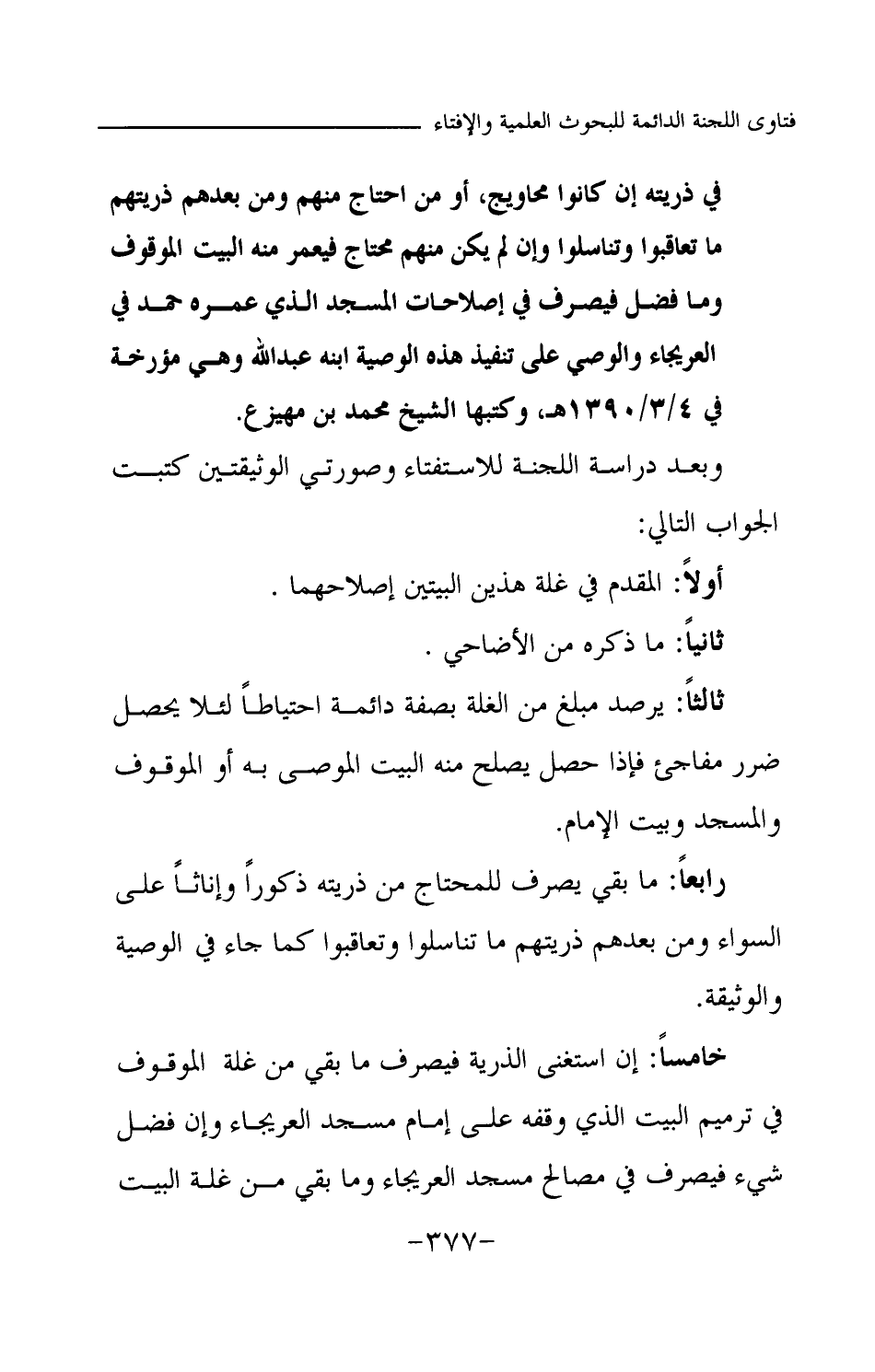 أولا: المقدم في غلة هذين البيتين إصلاحهما. ثانيا: ما ذكره من الأضاحي. ثالثا: يرصد مبلغ من الغلة بصفة دائمة احتياطا لئلا يحصل ضرر مفاجئ فإذا حصل يصلح منه البيت الموصى به أو الموقوف والمسجد وبيت الإمام. رابعا: ما بقي يصرف للمحتاج من ذريته ذكورا وإناثا على السواء ومن بعدهم ذريتهم ما تناسلوا وتعاقبوا كما جاء في الوصية والوثيقة. خامسا: إن استغنى الذرية فيصرف ما بقي من غلة الموقوف في ترميم البيت الذي وقفه على إمام مسجد العريجاء وإن فضل شيء فيصرف في مصالح مسجد العريجاء وما بقي من غلة البيت