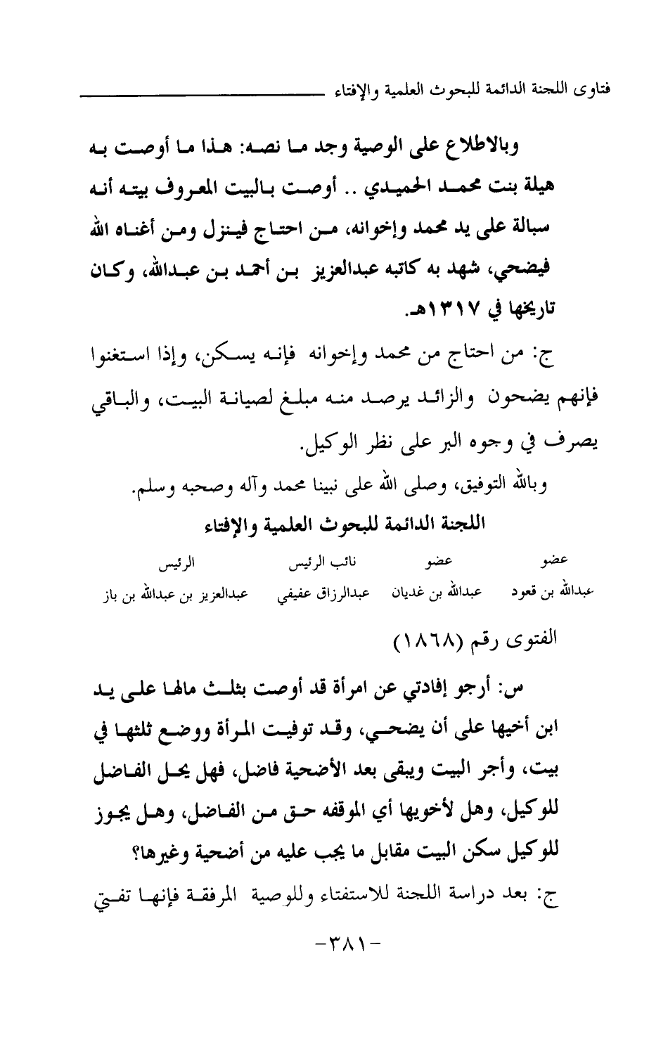 ج: بعد دراسة اللجنة للاستفتاء وللوصية المرفقة فإنها تفتي