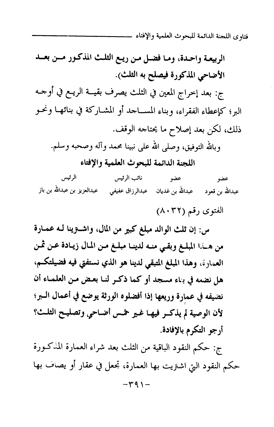 س: إن ثلث الوالد مبلغ كبير من المال، واشترينا له عمارة من هذا المبلغ وبقي منه لدينا مبلغ من المال زيادة عن ثمن العمارة، وهذا المبلغ المتبقي لدينا هو الذي نستفتي فيه فضيلتكم، هل نضعه في بناء مسجد أو كما ذكر بعض من العلماء أن نضيفه في عمارة وريعها إذا أفضلوه الورثة يوضع في أعمال البر؛ لأن الوصية لم يذكر فيها غير خمس أضاح وتصليح الثلث؟ أرجو التكرم بالإفادة.