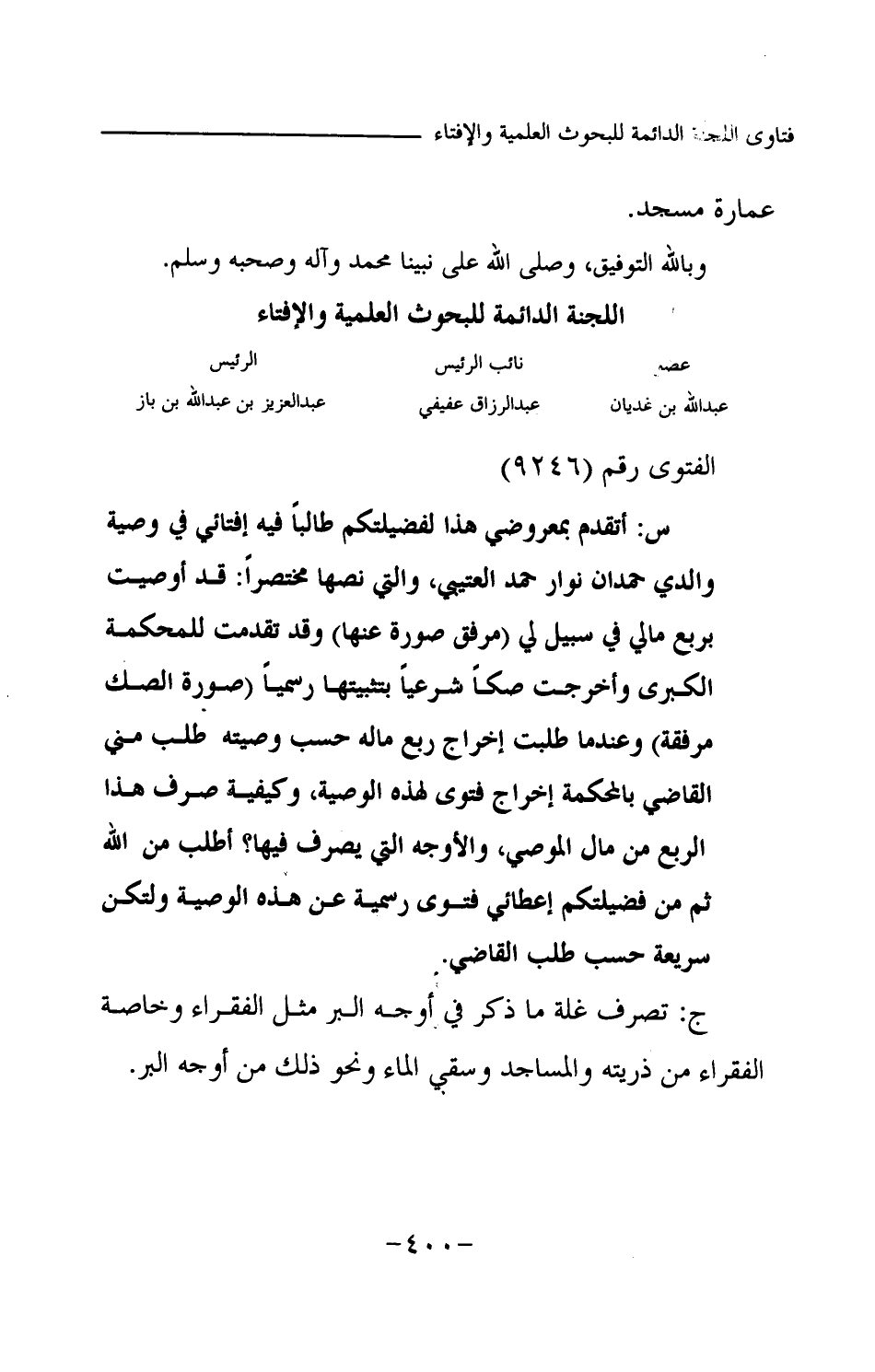 س: أتقدم بمعروضي هذا لفضيلتكم طالبا فيه إفتائي في وصية والدي حمدان نوار حمد العتيبي، والتي نصها مختصرا: قد أوصيت بربع مالي في سبيل لي (مرفق صورة عنها) وقد تقدمت للمحكمة الكبرى وأخرجت صكا شرعيا بتثبيتها رسميا (صورة الصك مرفقة) وعندما طلبت إخراج ربع ماله حسب وصيته طلب مني القاضي بالمحكمة إخراج فتوى لهذه الوصية، وكيفية صرف هذا الربع من مال الموصي، والأوجه التي يصرف فيها؟ أطلب من الله ثم من فضيلتكم إعطائي فتوى رسمية عن هذه الوصية ولتكن سريعة حسب طلب القاضي.