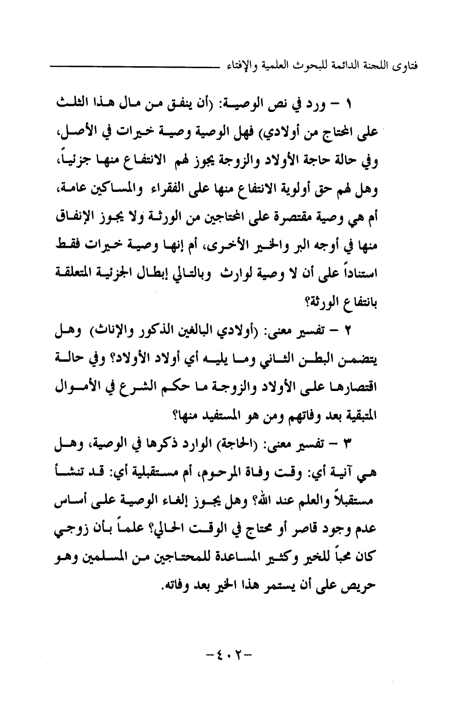 1 - ورد في نص الوصية: (أن ينفق من مال هذا الثلث على المحتاج من أولادي) فهل الوصية وصية خيرات في الأصل، وفي حالة حاجة الأولاد والزوجة يجوز لهم الانتفاع منها جزئيا، وهل لهم حق أولوية الانتفاع منها على الفقراء والمساكين عامة، أم هي وصية مقتصرة على المحتاجين من الورثة ولا يجوز الإنفاق منها في أوجه البر والخير الأخرى، أم إنها وصية خيرات فقط استنادا على أن لا وصية لوارث وبالتالي إبطال الجزئية المتعلقة بانتفاع الورثة؟