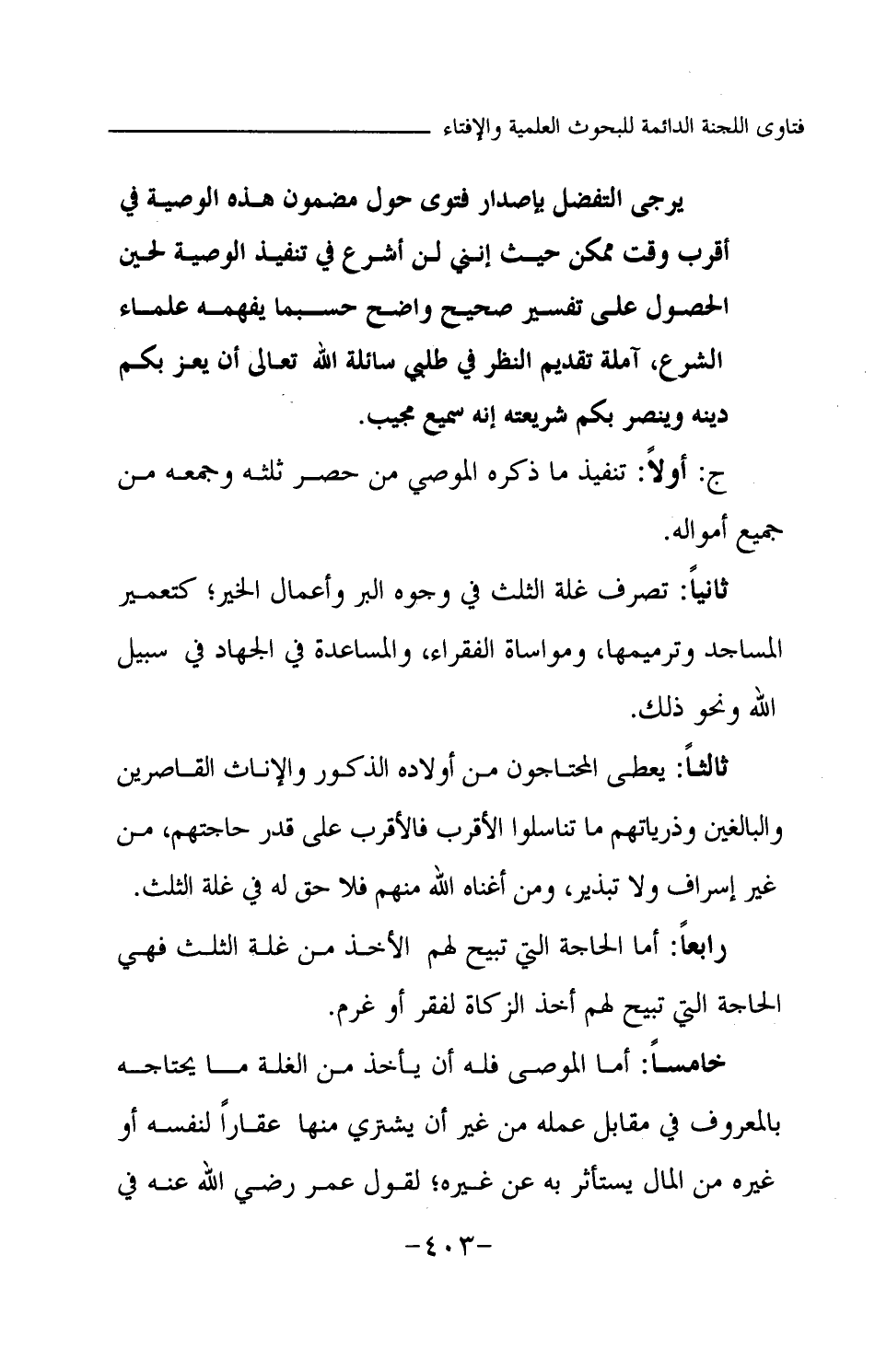 يرجى التفضل بإصدار فتوى حول مضمون هذه الوصية في أقرب وقت ممكن حيث إنني لن أشرع في تنفيذ الوصية لحين الحصول على تفسير صحيح واضح حسبما يفهمه علماء الشرع، آملة تقديم النظر في طلبي سائلة الله -تعالى- أن يعز بكم دينه وينصر بكم شريعته إنه سميع مجيب.