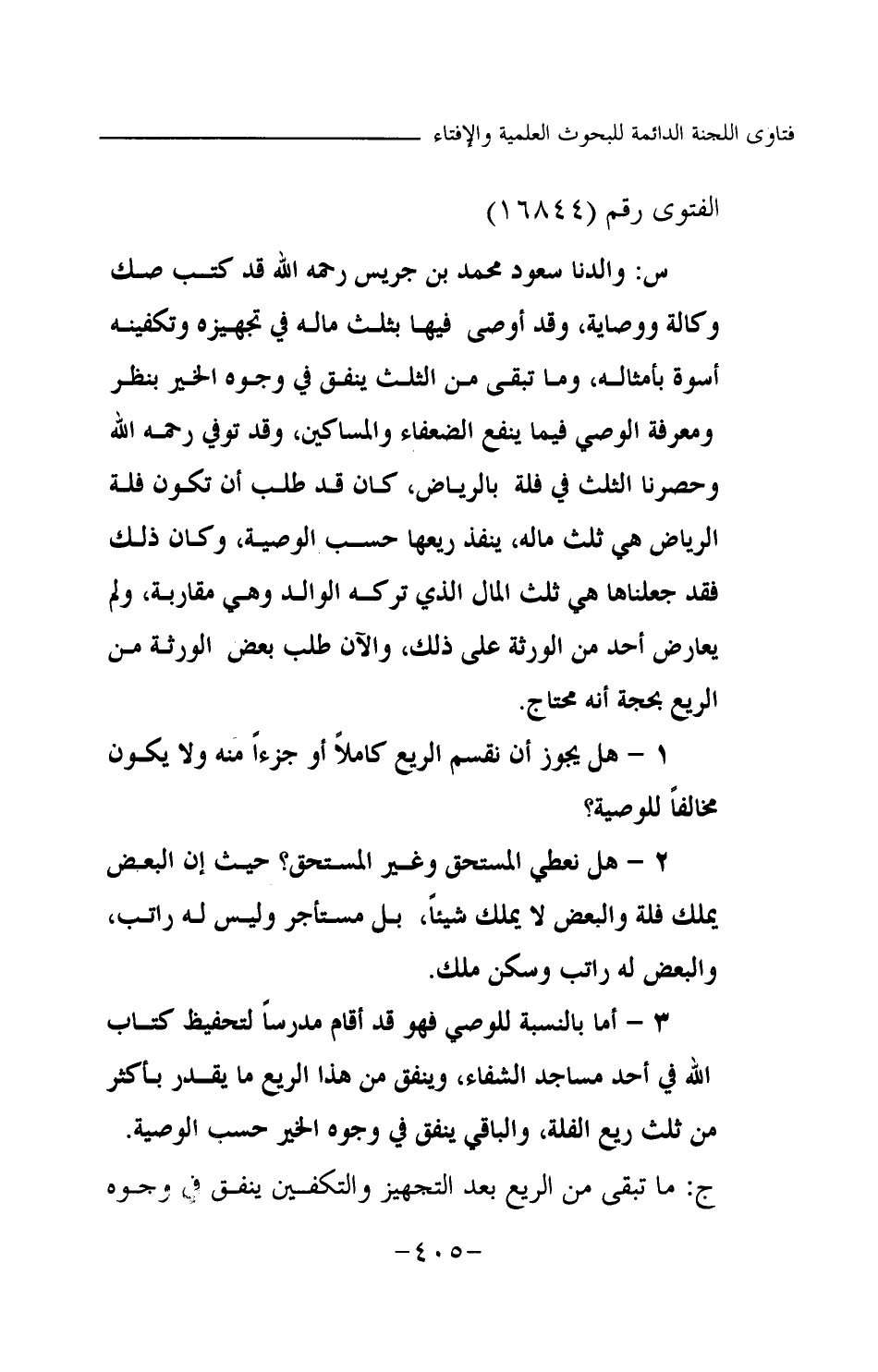 س: والدنا سعود محمد بن جريس -رحمه الله- قد كتب صك وكالة ووصاية، وقد أوصى فيها بثلث ماله في تجهيزه وتكفينه أسوة بأمثاله، وما تبقى من الثلث ينفق في وجوه الخير بنظر ومعرفة الوصي فيما ينفع الضعفاء والمساكين، وقد توفي -رحمه الله- وحصرنا الثلث في فلة بالرياض كان قد طلب أن تكون فلة الرياض هي ثلث ماله، ينفد ريعها حسب الوصية، وكان ذلك، فقد جعلناها هي ثلث المال الذي تركه الوالد وهي مقاربة، ولم يعارض أحد من الورثة على ذلك، والآن طلب بعض الورثة من الريع بحجة أنه محتاج.