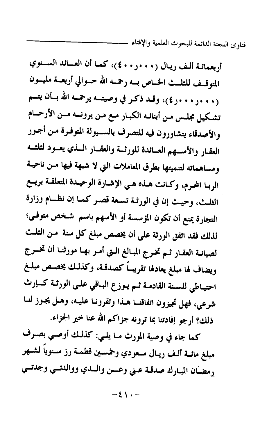 أربعمائة ألف ريال (400000) ، كما أن العائد السنوي المتوقف للثلث الخاص به -رحمه الله- حوالي أربعة مليون (4000000) ، وقد ذكر في وصيته يرحمه الله بأن يتم تشكيل مجلس من أبنائه الكبار مع من يرونه من الأرحام والأصدقاء يتشاورون فيه للتصرف بالسيولة المتوفرة من أجور العقار والأسهم العائدة للورثة والعقار الذي يعود لثلثه ومساهماته لتنميتها بطرق المعاملات التي لا شبهة فيها من ناحية الربا المحرم، وكانت هذه هي الإشارة الوحيدة المتعلقة بريع الثلث.