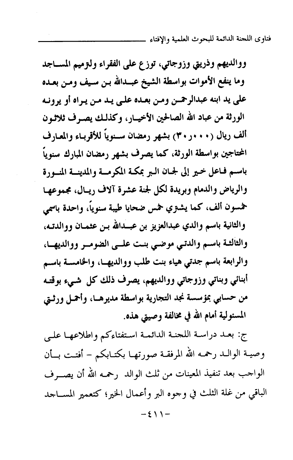 ووالديهم وذريتي وزوجاتي، توزع على الفقراء ولترميم المساجد وما ينفع الأموات بواسطة الشيخ عبد الله بن سيف ومن بعده على يد ابنه عبد الرحمن ومن بعده على يد من يراه أو يرونه الورثة من عباد الله الصالحين الأخيار، وكذلك يصرف ثلاثون ألف ريال (30000) بشهر رمضان سنويا للأقرباء والمعارف المحتاجين بواسطة الورثة.
