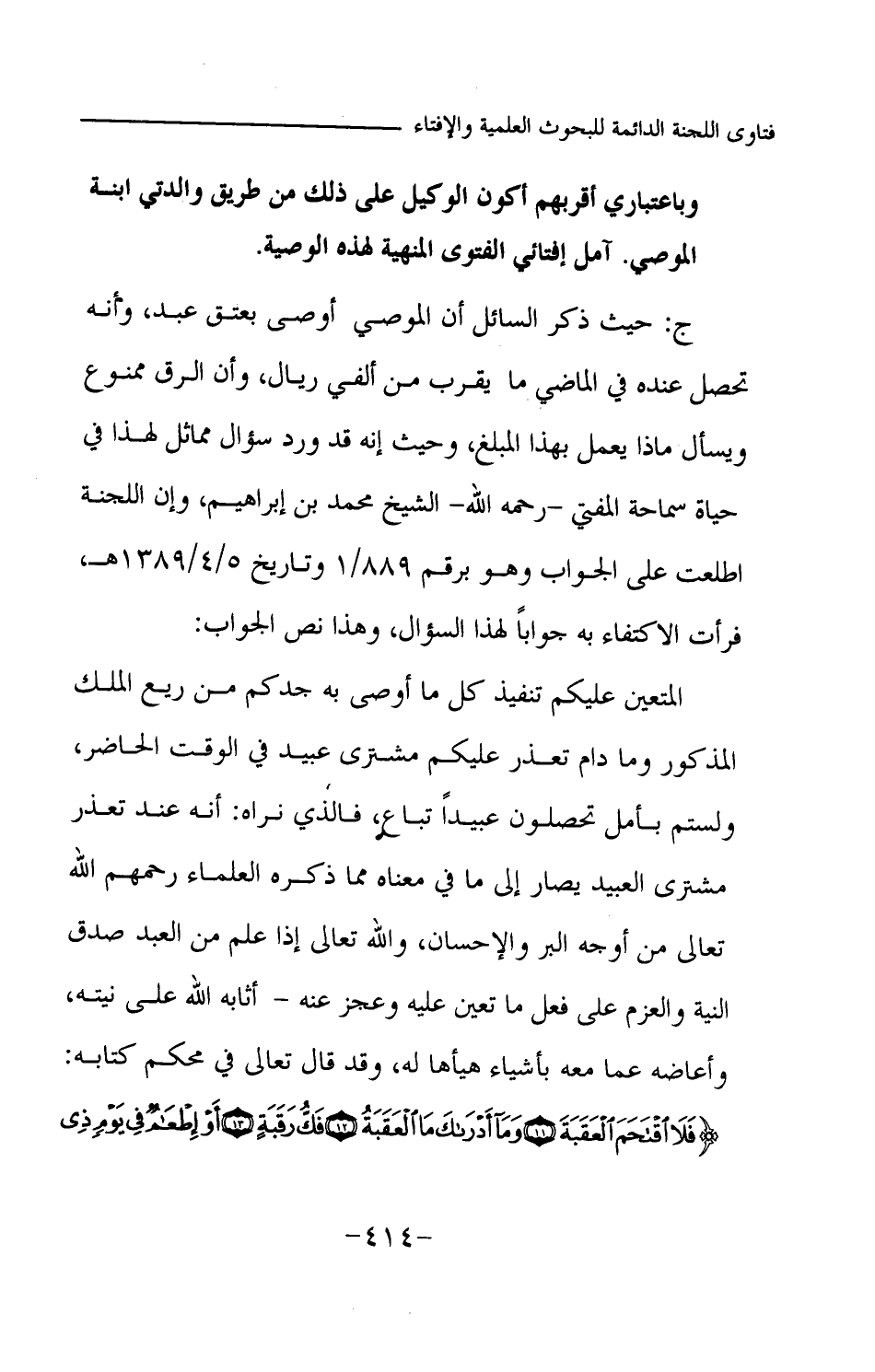 ج: حيث ذكر السائل أن الموصي أوصى بعتق عبد، وأنه تحصل عنده في الماضي ما يقرب من ألفي ريال، وأن الرق ممنوع ويسأل ماذا يعمل بهذا المبلغ، وحيث إنه قد ورد سؤال مماثل لهذا في حياة سماحة المفتي- رحمه الله- الشيخ محمد بن إبراهيم، وإن اللجنة اطلعت على الجواب وهو برقم 889 \ 1 وتاريخ 5 \ 4 \ 1389 هـ، فرأت الاكتفاء به جوابا لهذا السؤال، وهذا نص الجواب: المتعين عليكم تنفيذ كل ما أوصى به جدكم من ريع الملك المذكور وما دام تعذر عليكم مشترى عبيد في الوقت الحاضر، ولستم بأمل تحصلون عبيدا تباع، فالذي نراه: أنه عند تعذر مشترى العبيد يصار إلى ما في معناه مما ذكره العلماء رحمهم الله تعالى من أوجه البر والإحسان، والله تعالى إذا علم من العبد صدق النية والعزم على فعل ما تعين عليه وعجز عنه- أثابه الله على نيته، وأعاضه عما معه بأشياء هيأها له، وقد قال تعالى في محكم كتابه: {فَلَا اقْتَحَمَ الْعَقَبَةَ} (¬1) {وَمَا أَدْرَاكَ مَا الْعَقَبَةُ} (¬2) {فَكُّ رَقَبَةٍ} (¬3) {أَوْ إِطْعَامٌ فِي يَوْمٍ ذِي مَسْغَبَةٍ} (¬4) {يَتِيمًا ذَا مَقْرَبَةٍ} (¬5) {أَوْ مِسْكِينًا ذَا مَتْرَبَةٍ} (¬6)