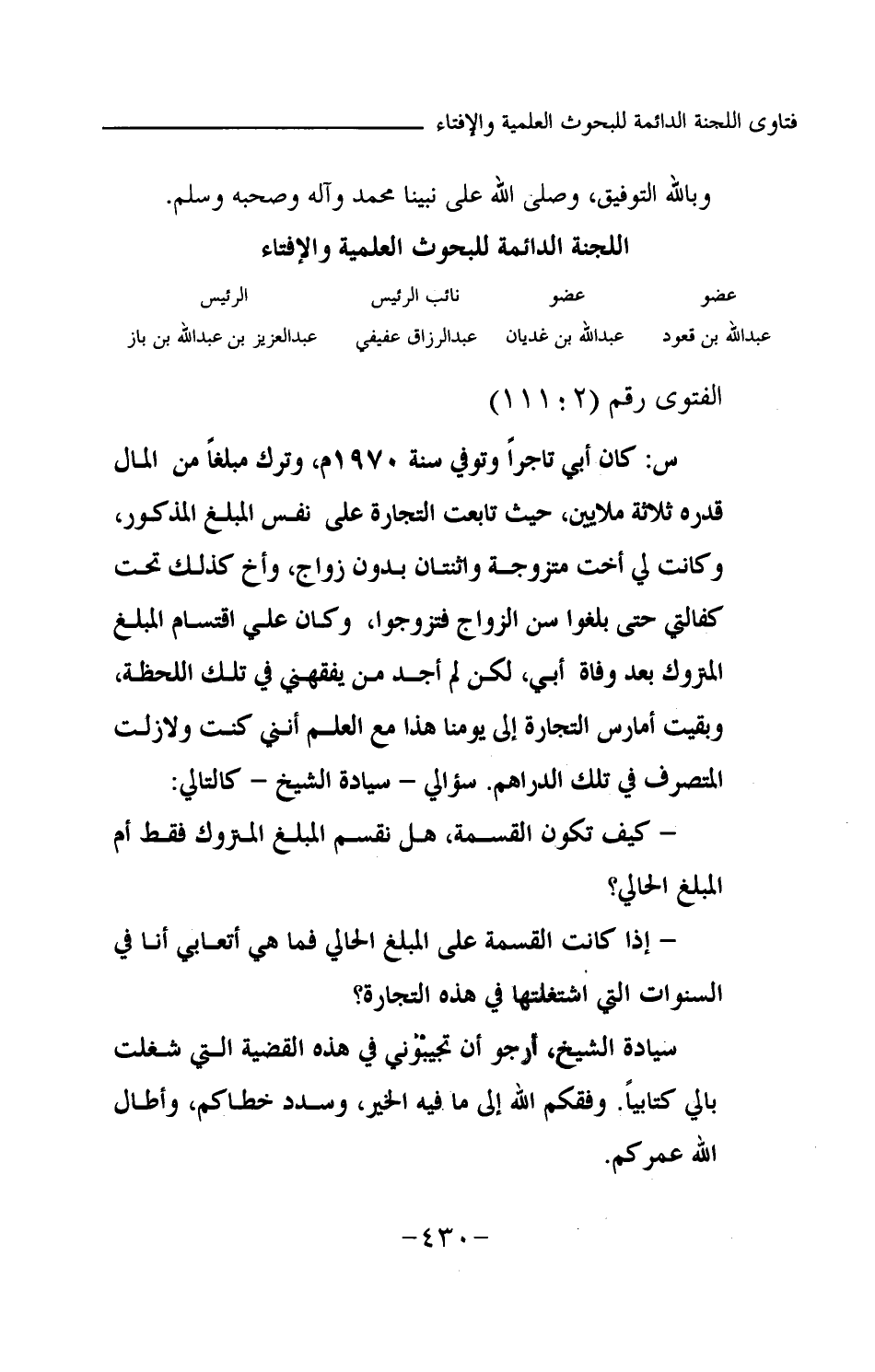 س: كان أبي تاجرا وتوفي سنة 1970 م، وترك مبلغا من المال قدره ثلاثة ملايين، حيث تابعت التجارة على نفس المبلغ المذكور، وكانت لي أخت متزوجة واثنتان بدون زواج، وأخ كذلك تحت كفالتي حتى بلغوا سن الزواج فتزوجوا، وكان علي اقتسام المبلغ المتروك بعد وفاة أبي، لكن لم أجد من يفقهني في تلك اللحظة، وبقيت أمارس التجارة إلى يومنا هذا مع العلم أنني كنت ولا زلت المتصرف في تلك الدراهم.