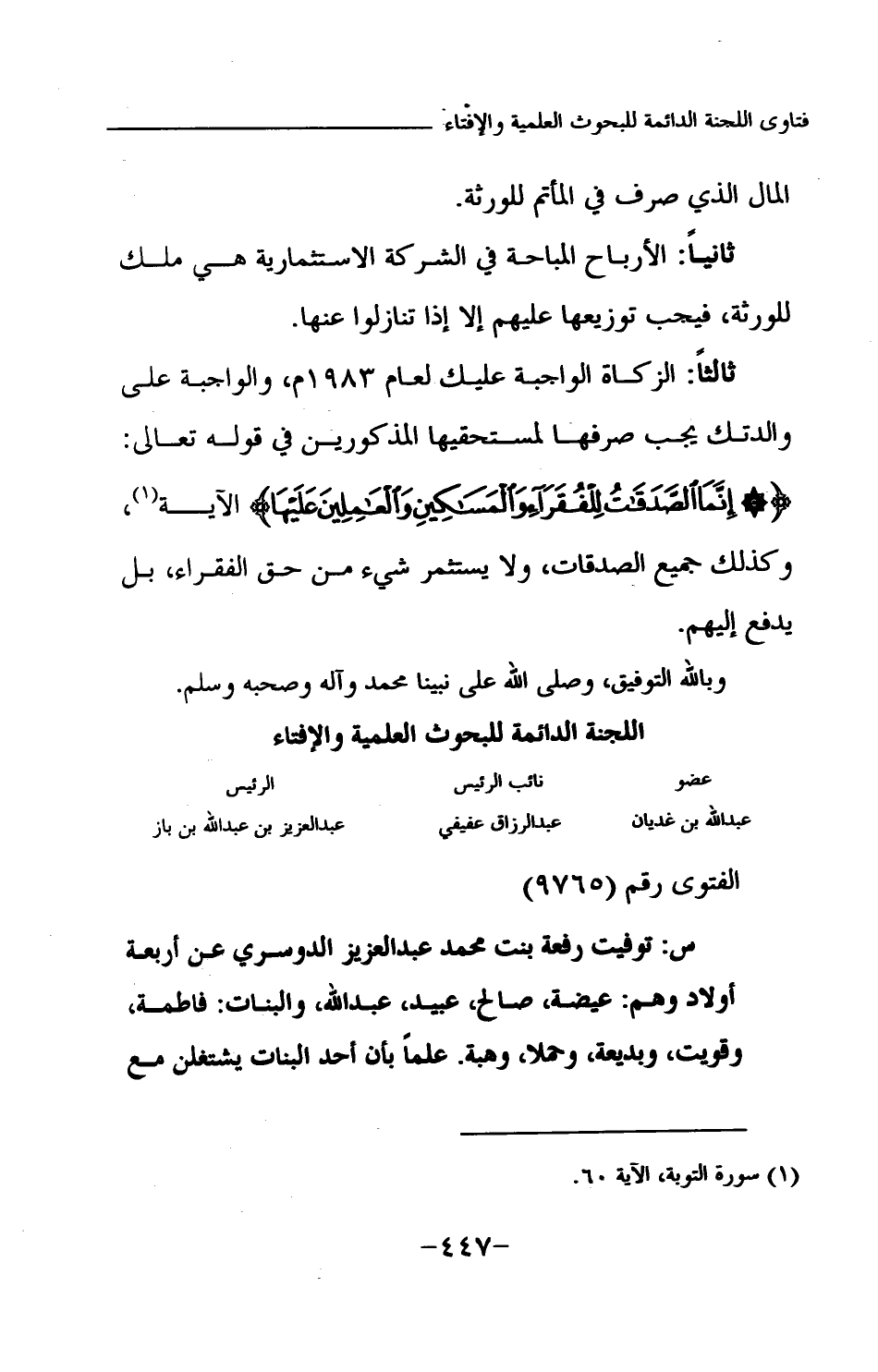المال الذي صرف في المأتم للورثة. ثانيا: الأرباح المباحة في الشركة الاستثمارية هي ملك للورثة، فيجب توزيعها عليهم إلا إذا تنازلوا عنها. ثالثا: الزكاة الواجبة عليك لعام 1983 م، والواجبة على والدتك يجب صرفها لمستحقيها المذكورين في قوله تعالى: {إِنَّمَا الصَّدَقَاتُ لِلْفُقَرَاءِ وَالْمَسَاكِينِ وَالْعَامِلِينَ عَلَيْهَا} (¬1) الآية، وكذلك جميع الصدقات، ولا يستثمر شيء من حق الفقراء، بل يدفع إليهم. وبالله التوفيق، وصلى الله على نبينا محمد وآله وصحبه وسلم.