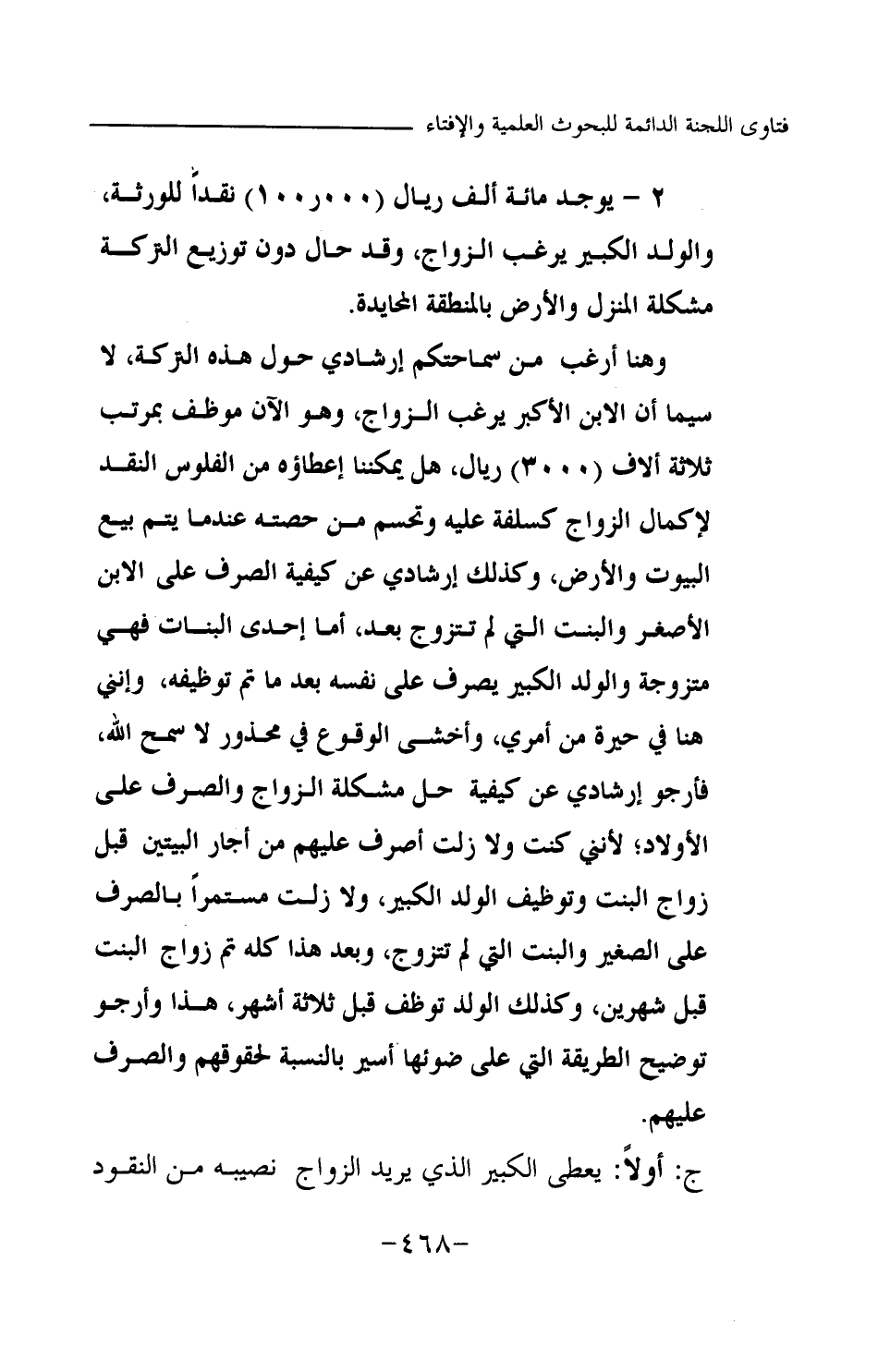 وهنا أرغب من سماحتكم إرشادي حول هذه التركة، لا سيما أن الابن الأكبر يرغب الزواج، وهو الآن موظف بمرتب ثلاثة آلاف (3000) ريال، هل يمكننا إعطاؤه من الفلوس النقد لإكمال الزواج كسلفة عليه وتحسم من حصته عندما يتم بيع البيوت والأرض، وكذلك إرشادي عن كيفية الصرف على الابن الأصغر والبنت التي لم تتزوج بعد، أما إحدى البنات فهي متزوجة والولد الكبير يصرف على نفسه بعد ما تم توظيفه، وإنني هنا في حيرة من أمري، وأخشى الوقوع في محذور لا سمح الله، فأرجو إرشادي عن كيفية حل مشكلة الزواج والصرف على الأولاد، لأنني كنت ولا زلت أصرف عليهم من إيجار البيتين قبل زواج البنت وتوظيف الولد الكبير، ولا زلت مستمرا بالصرف على الصغير والبنت التي لم تتزوج، وبعد هذا كله تم زواج البنت قبل شهرين، وكذلك الولد توظف قبل ثلاثة أشهر، هذا وأرجو توضيح الطريقة التي على ضوئها أسير بالنسبة لحقوقهم والصرف عليهم.