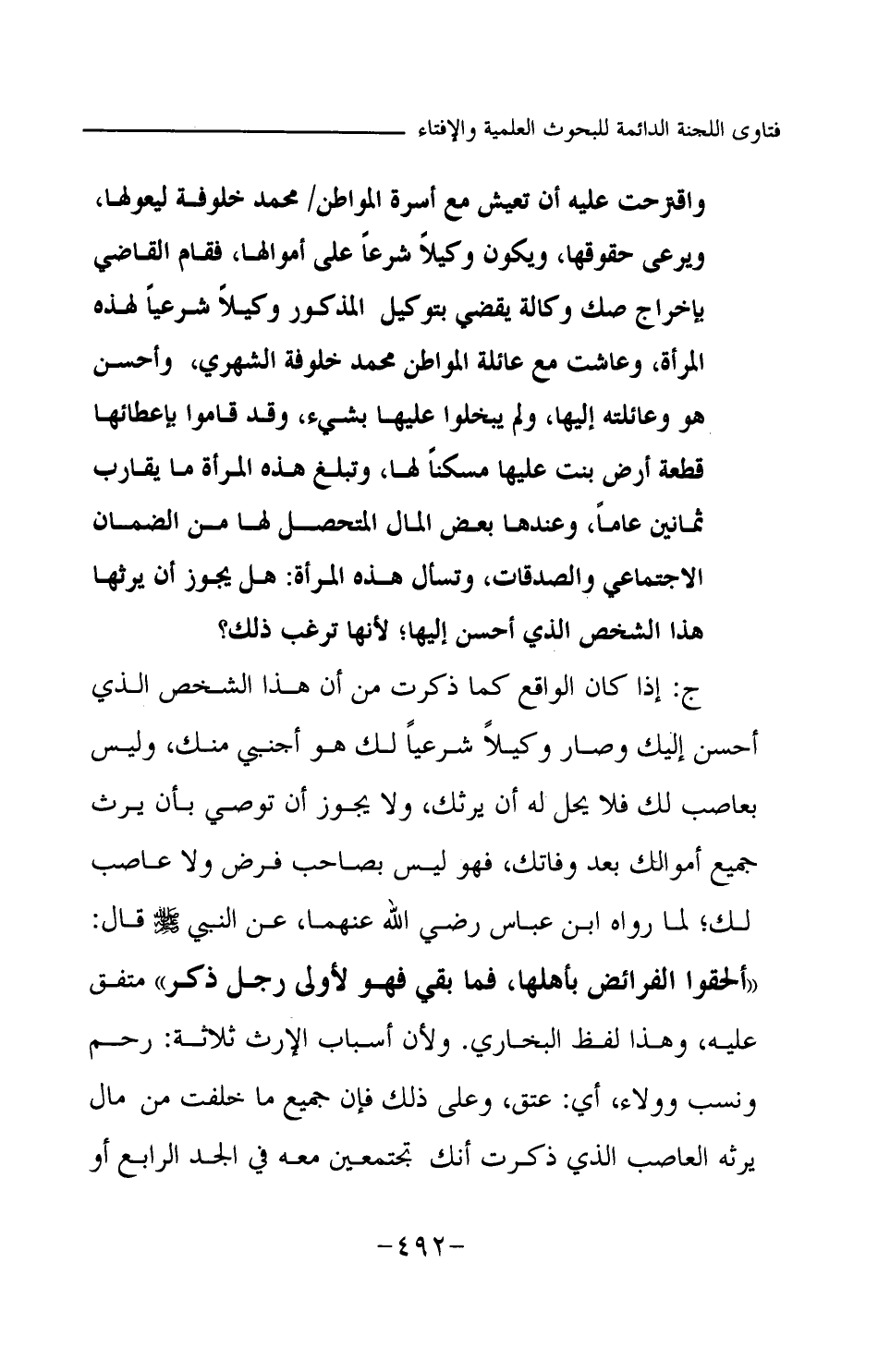ج: إذا كان الواقع كما ذكرت من أن هذا الشخص الذي أحسن إليك وصار وكيلا شرعيا لك هو أجنبي منك، وليس بعاصب لك فلا يحل له أن يرثك، ولا يجوز أن توصي بأن يرث جميع أموالك بعد وفاتك، فهو ليس بصاحب فرض ولا عاصب لك، لما رواه ابن عباس رضي الله عنهما، عن النبي -صلى الله عليه وسلم- قال: «ألحقوا الفرائض بأهلها، فما بقي فهو لأولى رجل ذكر (¬1) » متفق عليه وهذا لفظ البخاري. ولأن أسباب الإرث ثلاثة: رحم ونسب وولاء، أي: عتق، وعلى ذلك فإن جميع ما خلفت من مال يرثه العاصب الذي ذكرت أنك تجتمعين معه في الجد الرابع أو
