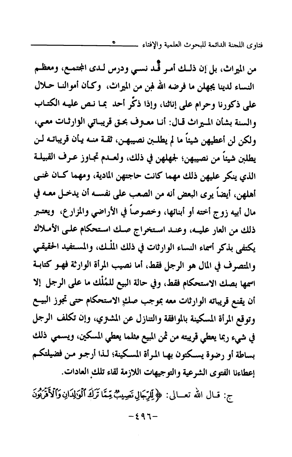 من الميراث، بل إن ذلك أمر قد نسي ودرس لدى المجتمع، ومعظم النساء لدينا يجهلن ما فرضه الله لهن من الميراث، وكأن أموالنا حلال على ذكورنا وحرام على إناثنا، وإذا ذكر أحد بما نص عليه الكتاب والسنة بشأن الميراث قال: أنا معترف بحق قريباتي الوارثات معي، ولكن لن أعطيهن شيئا ما لم يطلبن نصيبهن، ثقة منه بأن قريباته لن يطلبن شيئا من نصيبهن؛ لجهلهن في ذلك، ولعدم تجاوز عرف القبيلة الذي ينكر عليهن ذلك مهما كانت حاجتهن المادية، ومهما كان غنى أهلهن، أيضا يرى البعض أنه من الصعب على نفسه أن يدخل معه في مال أبيه زوج أخته أو أبنائها، وخصوصا في الأراضي والمزارع، ويعتبر ذلك من العار عليه، وعند استخراج صك استحكام على الأملاك يكتفى بذكر أسماء النساء الوارثات في ذلك الملك، والمستفيد الحقيقي والمتصرف في المال هو الرجل فقط، أما نصيب المرأة الوارثة فهو كتابة اسمها بصك الاستحكام فقط، وفي حالة البيع للملك ما على الرجل إلا أن يقنع قريباته الوارثات معه بموجب صك الاستحكام حتى تجوز البيع وتوقع المرأة المسكينة بالموافقة والتنازل عن المشتري، وإن تكلف الرجل في شيء ربما يعطي قريبته من ثمن المبيع مثلما يعطي المسكين، ويسمي ذلك بساطة أو رضوة يسكتون بها المرأة المسكينة؛ لذا أرجو من فضيلتكم إعطاءنا الفتوى الشرعية والتوجيهات اللازمة لقاء تلك العادات.
