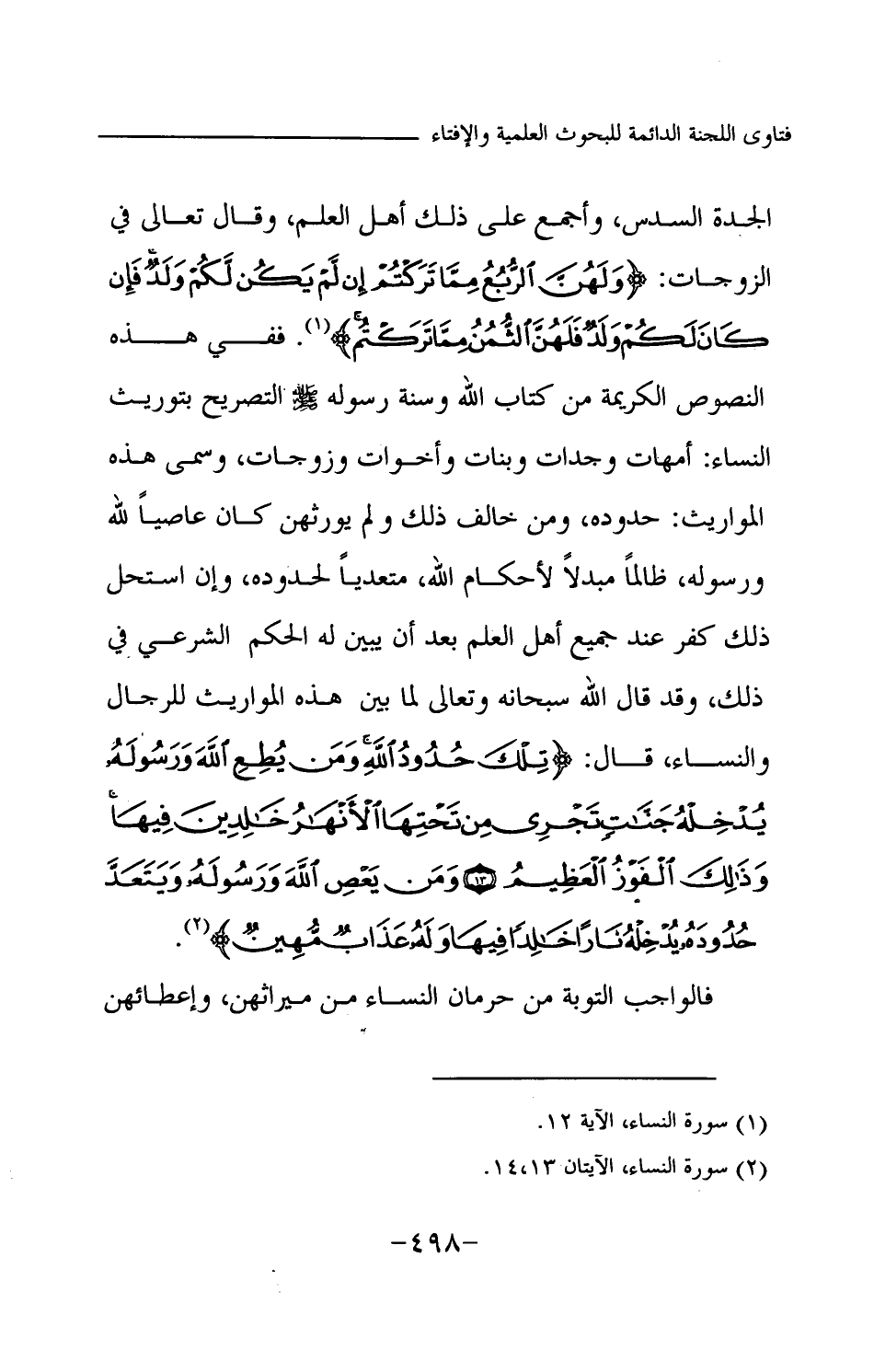وأجمع على ذلك أهل العلم، وقال تعالى في الزوجات: {وَلَهُنَّ الرُّبُعُ مِمَّا تَرَكْتُمْ إِنْ لَمْ يَكُنْ لَكُمْ وَلَدٌ فَإِنْ كَانَ لَكُمْ وَلَدٌ فَلَهُنَّ الثُّمُنُ مِمَّا تَرَكْتُمْ} (¬1) ففي هذه النصوص الكريمة من كتاب الله وسنة رسوله -صلى الله عليه وسلم- التصريح بتوريث النساء: أمهات وجدات وبنات وأخوات وزوجات، وسمى هذه المواريث: حدوده، ومن خالف ذلك ولم يورثهن كان عاصيا لله ورسوله، ظالما مبدلا لأحكام الله، متعديا لحدوده، وإن استحل ذلك كفر عند جميع أهل العلم بعد أن يبين له الحكم الشرعي في ذلك، وقد قال الله سبحانه وتعالى لما بين هذه المواريث للرجال والنساء، قال: {تِلْكَ حُدُودُ اللَّهِ وَمَنْ يُطِعِ اللَّهَ وَرَسُولَهُ يُدْخِلْهُ جَنَّاتٍ تَجْرِي مِنْ تَحْتِهَا الْأَنْهَارُ خَالِدِينَ فِيهَا وَذَلِكَ الْفَوْزُ الْعَظِيمُ} (¬2) {وَمَنْ يَعْصِ اللَّهَ وَرَسُولَهُ وَيَتَعَدَّ حُدُودَهُ يُدْخِلْهُ نَارًا خَالِدًا فِيهَا وَلَهُ عَذَابٌ مُهِينٌ} (¬3) فالواجب التوبة من حرمان النساء من ميراثهن، وإعطائهن