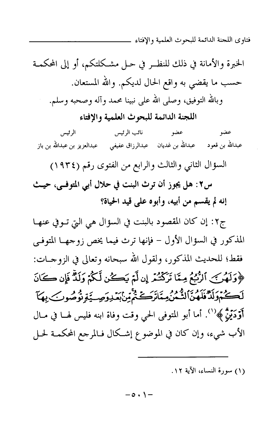 ج2: إن كان المقصود بالبنت في السؤال هي التي توفي عنها المذكور في السؤال الأول- فإنها ترث فيما يخص زوجها المتوفى فقط، للحديث المذكور، ولقول الله سبحانه وتعالى في الزوجات: {وَلَهُنَّ الرُّبُعُ مِمَّا تَرَكْتُمْ إِنْ لَمْ يَكُنْ لَكُمْ وَلَدٌ فَإِنْ كَانَ لَكُمْ وَلَدٌ فَلَهُنَّ الثُّمُنُ مِمَّا تَرَكْتُمْ مِنْ بَعْدِ وَصِيَّةٍ تُوصُونَ بِهَا أَوْ دَيْنٍ} (¬1) أما أبو المتوفى الحي وقت وفاة ابنه فليس لها في مال الأب شيء، وإن كان في الموضوع إشكال فالمرجع المحكمة لحل