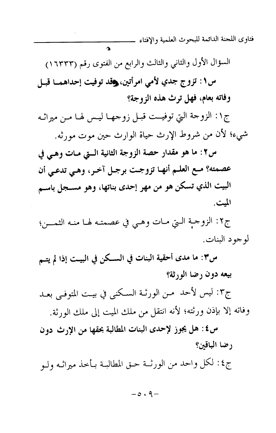 س1: تزوج جدي لأمي امرأتين، وقد توفيت إحداهما قبل وفاته بعام، فهل ترث هذه الزوجة؟