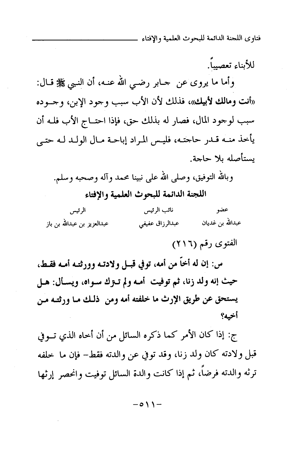 للأبناء تعصيبا. وأما ما يروى عن جابر رضي الله عنه، أن النبي -صلى الله عليه وسلم- قال: «أنت ومالك لأبيك (¬1) » فذلك لأن الأب سبب وجود الابن، وجوده سبب لوجود المال، فصار له بذلك حق، فإذا احتاج الأب فله أن يأخذ منه قدر حاجته، فليس المراد إباحة مال الولد له حتى يستأصله بلا حاجة. وبالله التوفيق، وصلى الله على نبينا محمد وآله وصحبه وسلم.