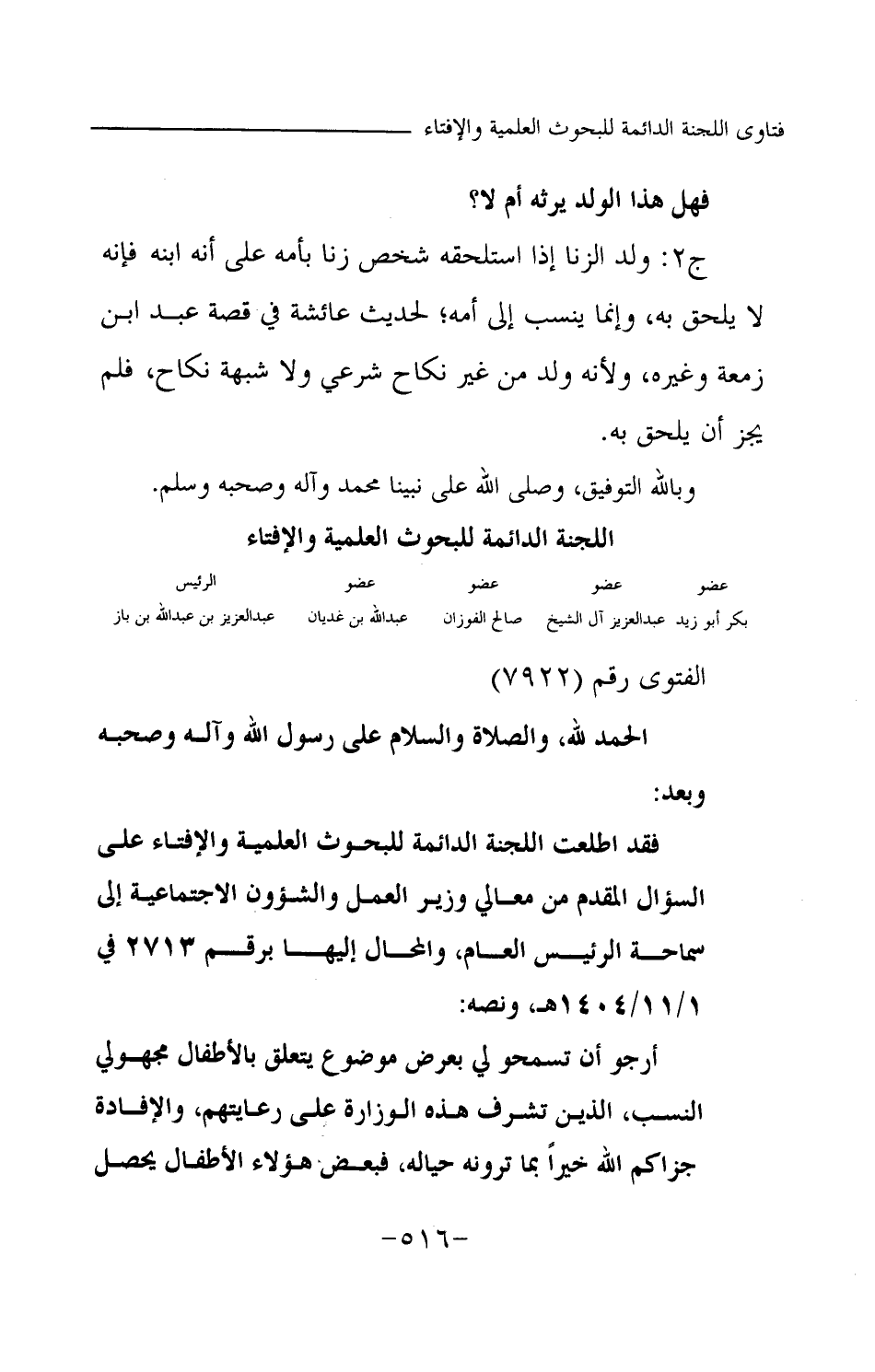 فقد اطلعت اللجنة الدائمة للبحوث العلمية والإفتاء على السؤال المقدم من معالي وزير العمل والشؤون الاجتماعية إلى سماحة الرئيس العام، والمحال إليها برقم 2713 في 1 \ 11 \ 1404هـ، ونصه:
