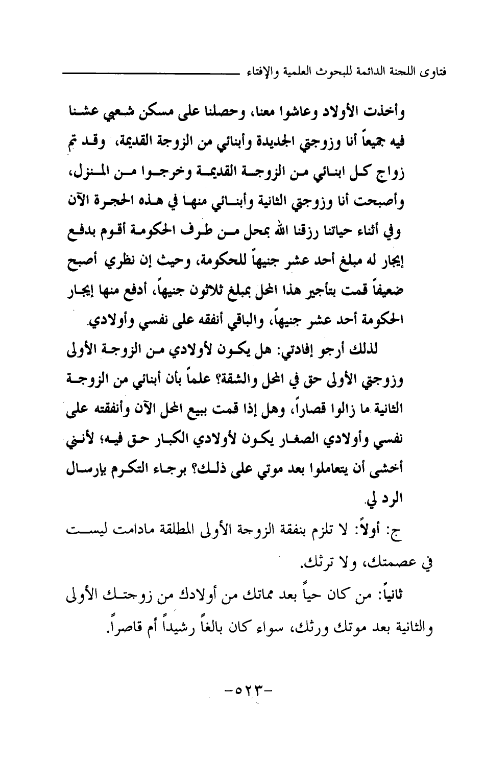 ج: أولا: لا تلزم بنفقة الزوجة الأولى المطلقة ما دامت ليست في عصمتك، ولا ترثك. ثانيا: من كان حيا بعد مماتك من أولادك من زوجتك الأولى والثانية بعد موتك ورثك، سواء كان بالغا رشيدا أم قاصرا. ثالثا: