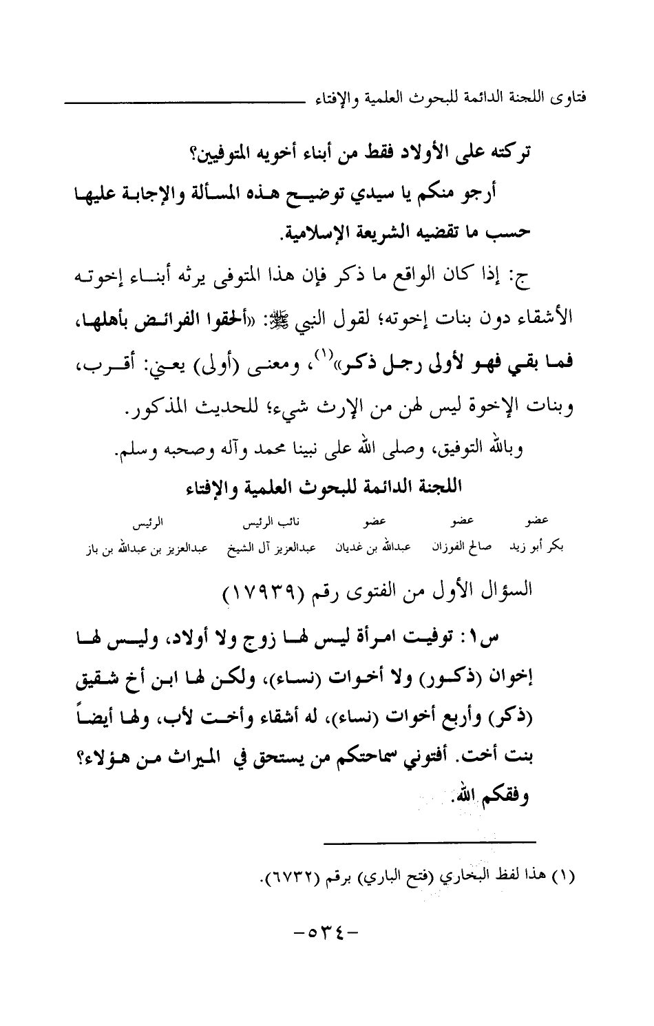 ج: إذا كان الواقع كما ذكر فإن هذا المتوفى يرثه أبناء إخوته الأشقاء دون بنات إخوته؛ لقول النبي -صلى الله عليه وسلم-: «ألحقوا الفرائض بأهلها، فما بقي فهو لأولى رجل ذكر (¬1) » ومعنى (أولى) يعني: أقرب، وبنات الإخوة ليس لهن من الإرث شيء؛ للحديث المذكور. وبالله التوفيق، وصلى الله على نبينا محمد وآله وصحبه وسلم.