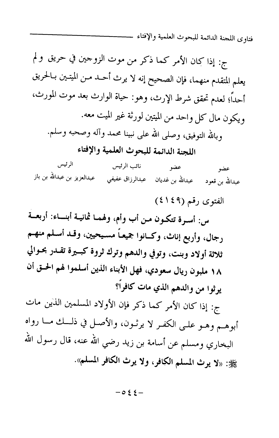 س: أسرة تتكون من أب وأم، ولهما ثمانية أبناء: أربعة رجال، وأربع إناث، وكانوا جميعا مسيحيين، وقد أسلم منهم ثلاثة أولاد وبنت، وتوفي والدهم وترك ثروة كبيرة تقدر بحوالي 18 مليون ريال سعودي، فهل الأبناء الذين أسلموا لهم الحق أن يرثوا من والدهم الذي مات كافرا؟