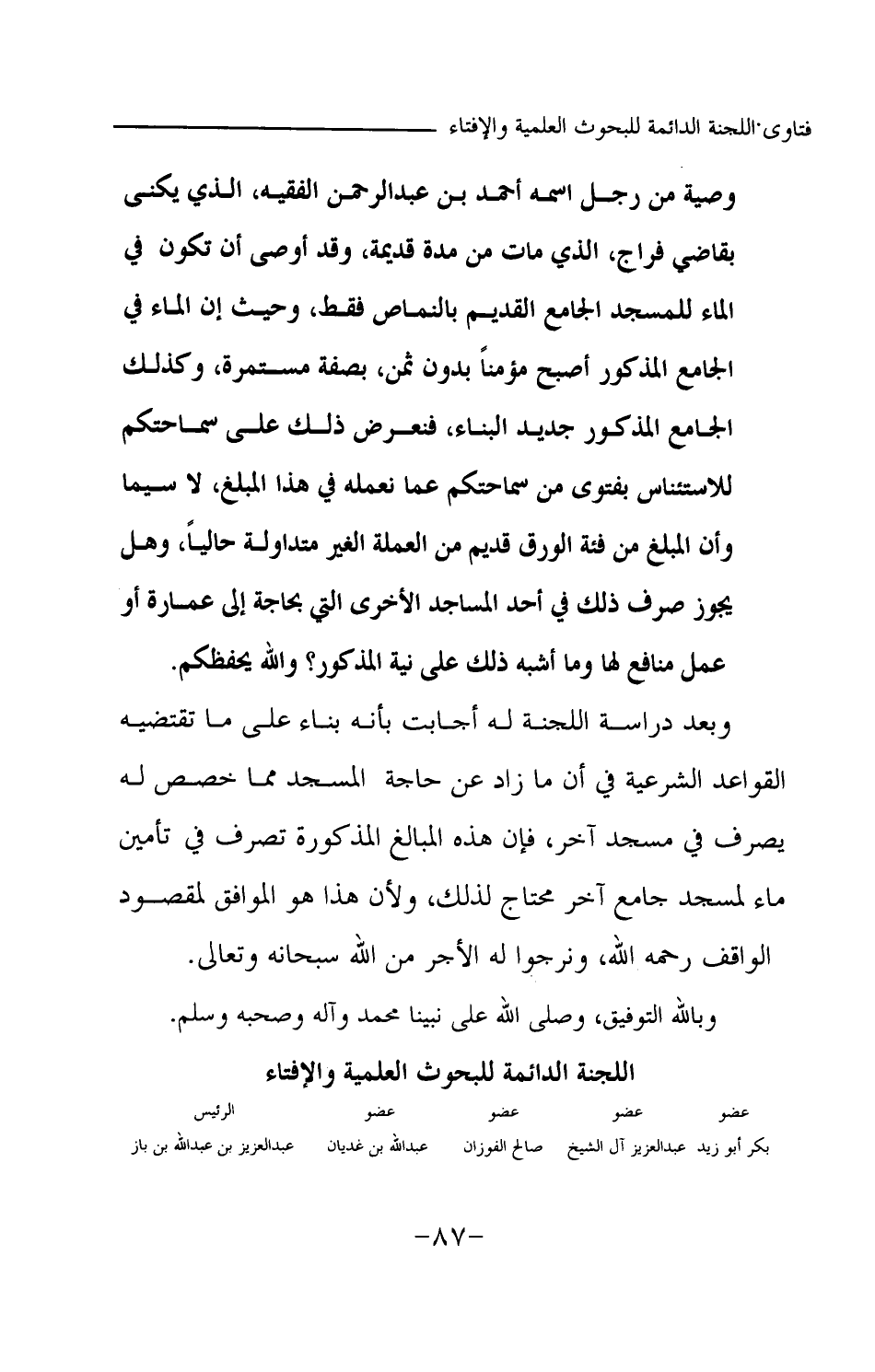 وبعد دراسة اللجنة له أجابت: بأنه بناء على ما تقتضيه القواعد الشرعية في أن ما زاد عن حاجة المسجد مما خصص له يصرف في مسجد آخر، فإن هذه المبالغ المذكورة تصرف في تأمين ماء لمسجد جامع آخر محتاج لذلك، ولأن هذا هو الموافق لمقصود الواقف رحمه الله، ونرجو له الأجر من الله سبحانه وتعالى. وبالله التوفيق، وصلى الله على نبينا محمد وآله وصحبه وسلم.