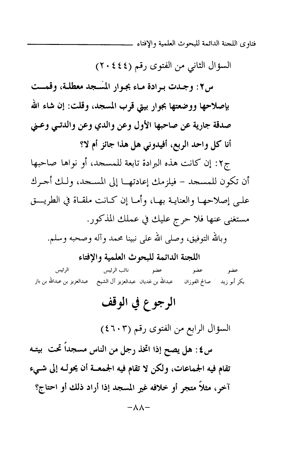 ج2: إن كان هذه البرادة تابعة للمسجد، أو نواها صاحبها أن تكون للمسجد- فيلزمك إعادتها إلى المسجد، ولك أجرك على إصلاحها والعناية بها، وأما إن كانت ملقاة في الطريق مستغنى عنها فلا حرج عليك في عملك المذكور. وبالله التوفيق، وصلى الله على نبينا محمد وآله وصحبه وسلم.