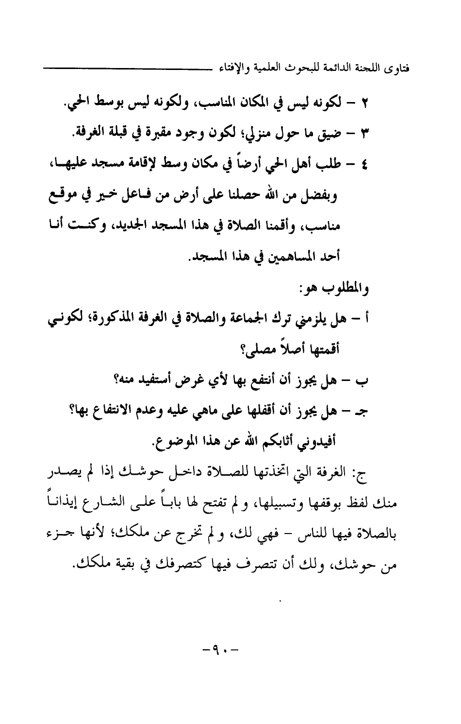 ج: الغرفة التي اتخذتها للصلاة داخل حوشك إذا لم يصدر منك لفظ بوقفها وتسبيلها، ولم تفتح لها بابا على الشارع إيذانا بالصلاة فيها للناس- فهي لك، ولم تخرج عن ملكك؛ لأنها جزء من حوشك، ولك أن تتصرف فيها كتصرفك في بقية ملكك.