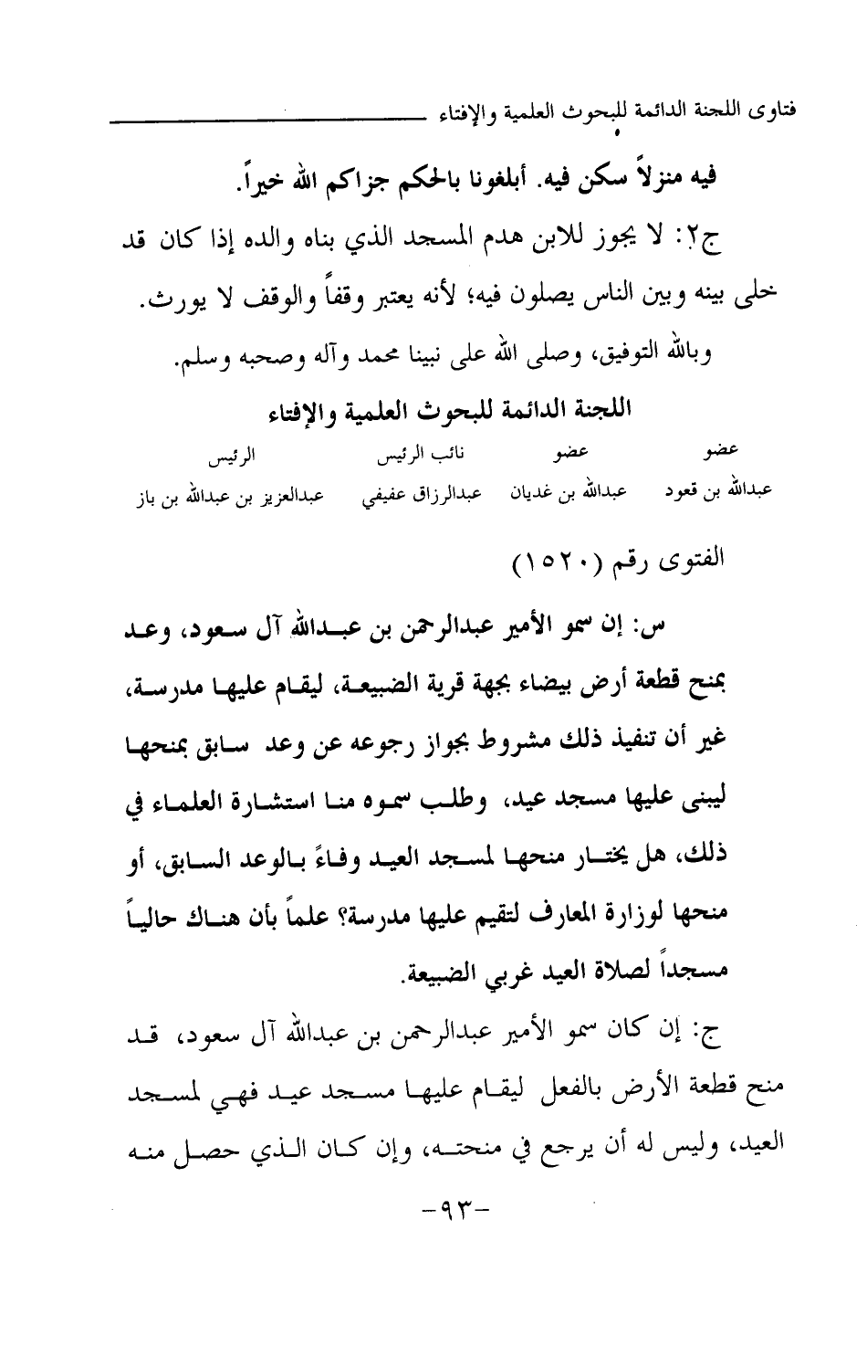 س: إن سمو الأمير عبد الرحمن بن عبد الله آل سعود وعد بمنح قطعة أرض بيضاء بجهة قرية الضبيعة ليبني عليها مدرسة، غير أن تنفيذ ذلك مشروط بجواز رجوعه عن وعد سابق بمنحها ليبني عليها مسجد عيد، وطلب سموه منا استشارة العلماء في ذلك، هل يختار منحها لمسجد العيد وفاء بالوعد السابق، أو منحها لوزارة المعارف لتقيم عليها مدرسة؟ علما بأن هناك حاليا مسجدا لصلاة العيد غربي الضبيعة