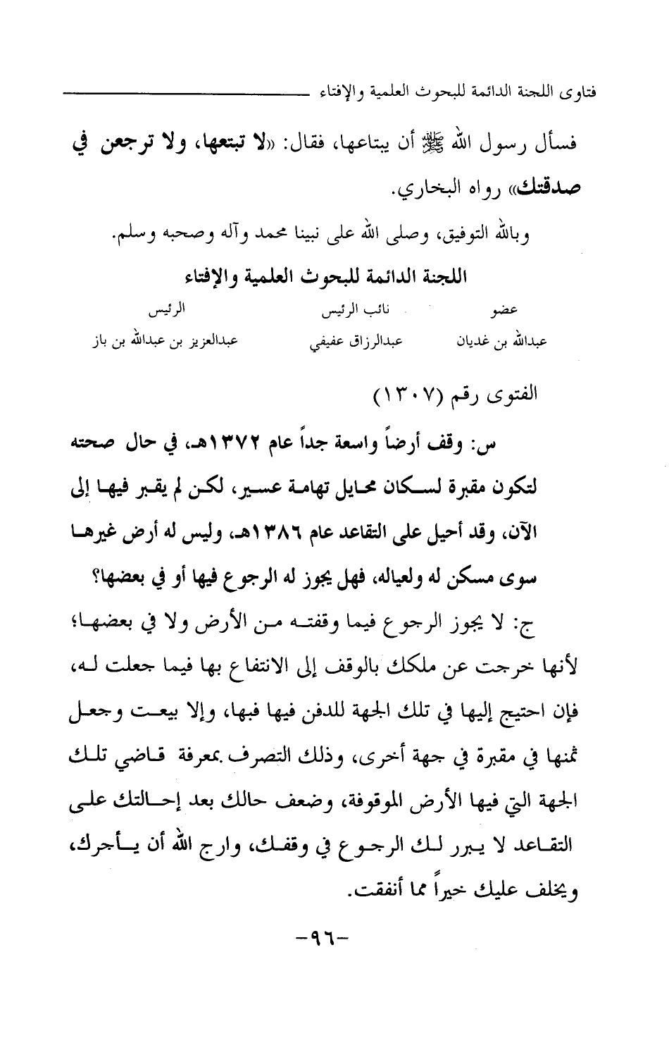 فسأل رسول الله -صلى الله عليه وسلم- أن يبتاعها، فقال: لا تبتعها، ولا ترجعن في صدقتك (¬1) » رواه البخاري. وبالله التوفيق، وصلى الله على نبينا محمد وآله وصحبه وسلم.