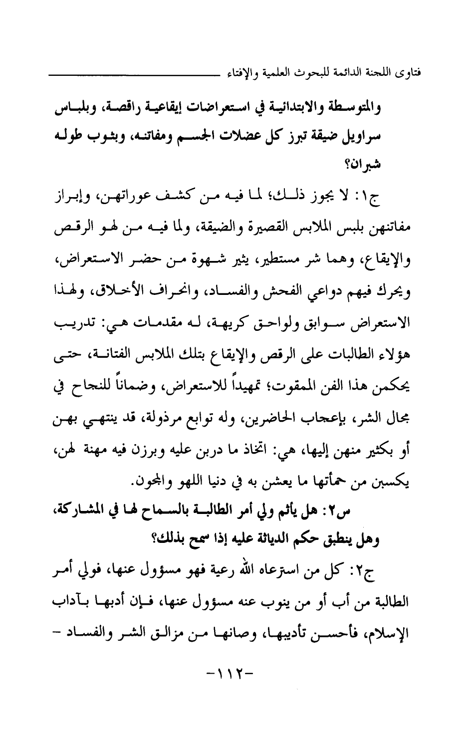 ج1: لا يجوز ذلك؛ لما فيه من كشف عوراتهن، وإبراز مفاتنهن بلبس الملابس القصيرة والضيقة، ولما فيه من لهو الرقص والإيقاع، وهما شر مستطير، يثير شهوة من حضر الاستعراض، ويحرك فيهم دواعي الفحش والفساد، وانحراف الأخلاق، ولهذا الاستعراض سوابق ولواحق كريهة، له مقدمات هي: تدريب هؤلاء الطالبات على الرقص والإيقاع بتلك الملابس الفتانة، حتى يحكمن هذا الفن الممقوت؛ تمهيدا للاستعراض، وضمانا للنجاح في مجال الشر، بإعجاب الحاضرين، وله توابع مرذولة، قد ينتهي بهن أو بكثير منهن إليها، هي: اتخاذ ما دربن عليه وبرزن فيه مهنة لهن، يكسبن من حمأتها ما يعشن به في دنيا اللهو والمجون. وبالله التوفيق، وصلى الله على نبينا محمد وآله وصحبه وسلم.