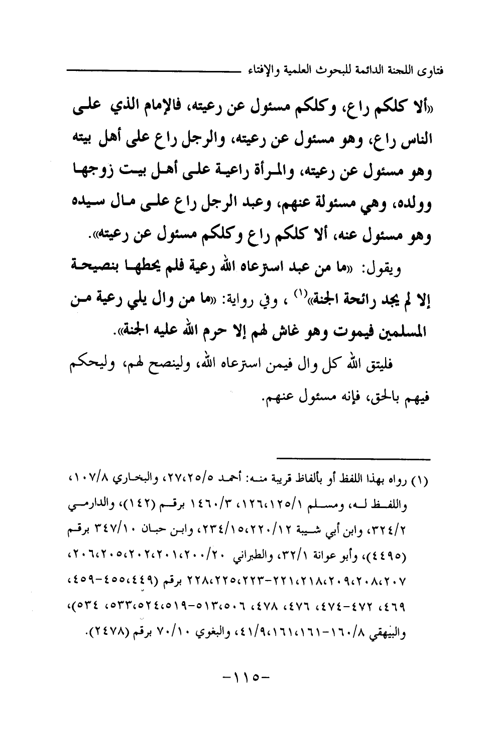 «ألا كلكم راع، وكلكم مسئول عن رعيته، فالإمام الذي على الناس راع، وهو مسئول عن رعيته، والرجل راع على أهل بيته وهو مسئول عن رعيته، والمرأة راعية على أهل بيت زوجها وولده، وهي مسئولة عنهم، وعبد الرجل راع على مال سيده وهو مسئول عنه، ألا كلكم راع وكلكم مسئول عن رعيته (¬1) » ويقول: «ما من عبد استرعاه الله رعية فلم يحطها بنصيحة إلا لم يجد رائحة الجنة (¬2) » وفي رواية: «ما من وال يلي رعية من المسلمين فيموت وهو غاش لهم إلا حرم الله عليه الجنة (¬3) » . فليتق الله كل وال فيمن استرعاه الله، ولينصح لهم، وليحكم فيهم بالحق، فإنه مسئول عنهم.