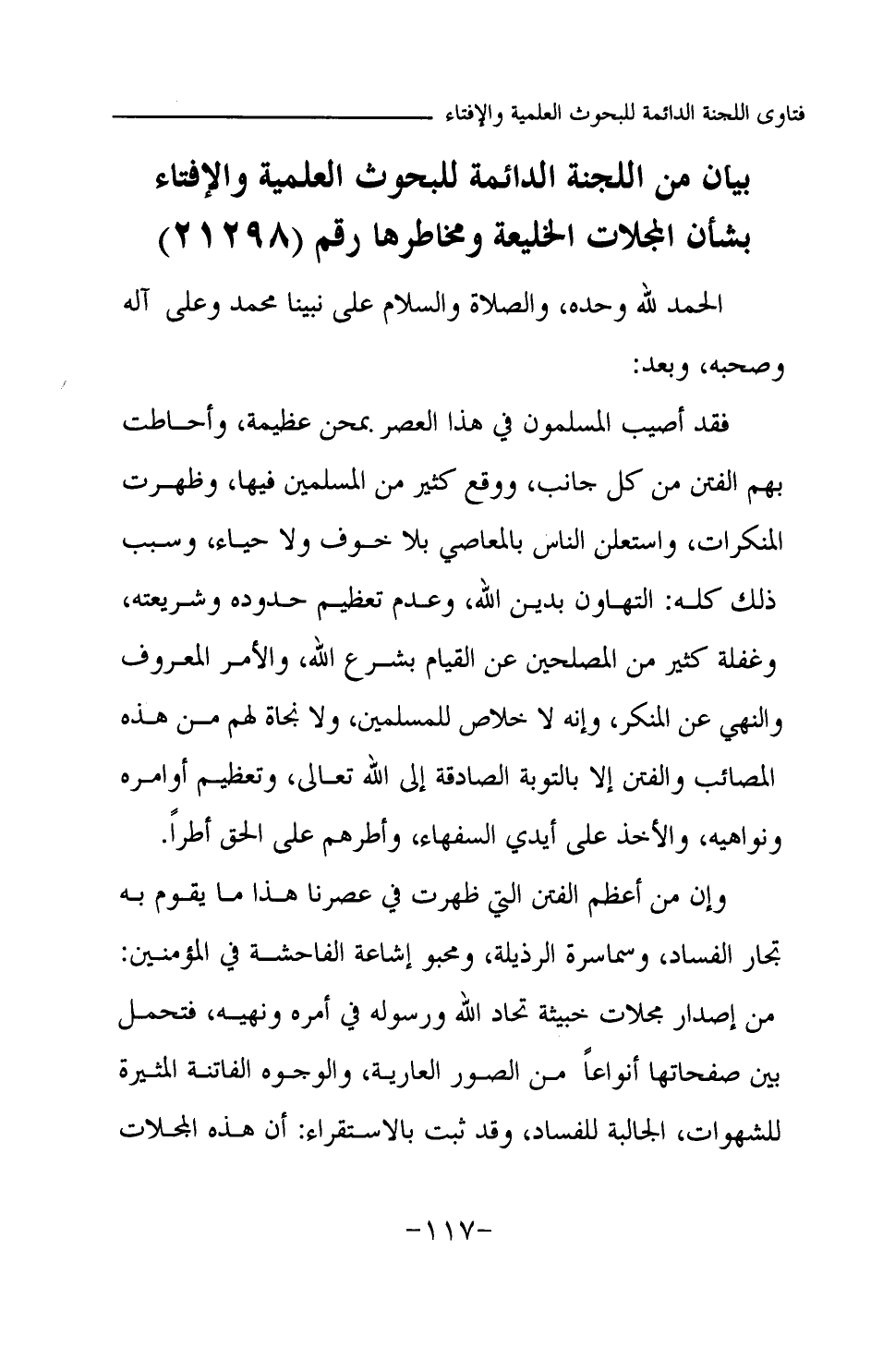 بيان من اللجنة الدائمة للبحوث العلمية والإفتاء بشأن المجلات الخليعة ومخاطرها رقم (21298)