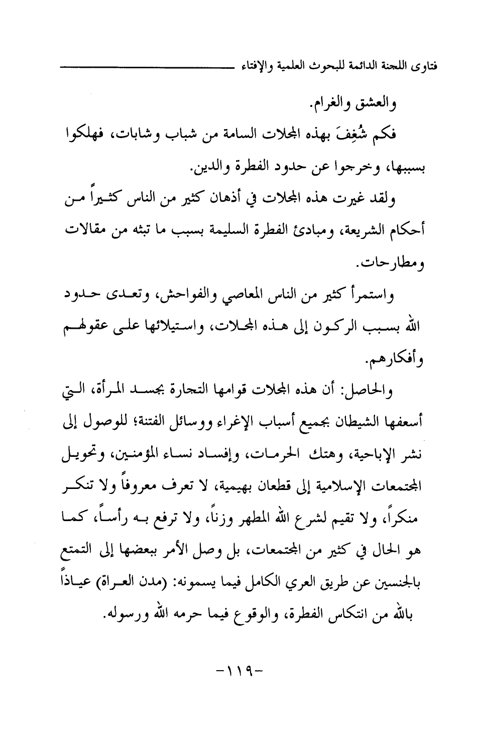 والعشق والغرام. فكم شغف بهذه المجلات السامة من شباب وشابات، فهلكوا بسببها، وخرجوا عن حدود الفطرة والدين. ولقد غيرت هذه المجلات في أذهان كثير من الناس كثيرا من أحكام الشريعة، ومبادئ الفطرة السليمة بسبب ما تبثه من مقالات ومطارحات. واستمرأ كثير من الناس المعاصي والفواحش، وتعدى حدود الله بسبب الركون إلى هذه المجلات، واستيلائها على عقولهم وأفكارهم. والحاصل: أن هذه المجلات قوامها التجارة بجسد المرأة، التي أسعفها الشيطان بجميع أسباب الإغراء ووسائل الفتنة؛ للوصول إلى نشر الإباحية، وهتك الحرمات، وإفساد نساء المؤمنين، وتحويل المجتمعات الإسلامية إلى قطعان بهيمية، لا تعرف معروفا ولا تنكر منكرا، ولا تقيم لشرع الله المطهر وزنا، ولا ترفع به رأسا، كما هو الحال في كثير من المجتمعات، بل وصل الأمر ببعضها إلى التمتع بالجنسين عن طريق العري الكامل فيما يسمونه: (مدن العراة) عياذا بالله من انتكاس الفطرة، والوقوع فيما حرمه الله ورسوله.