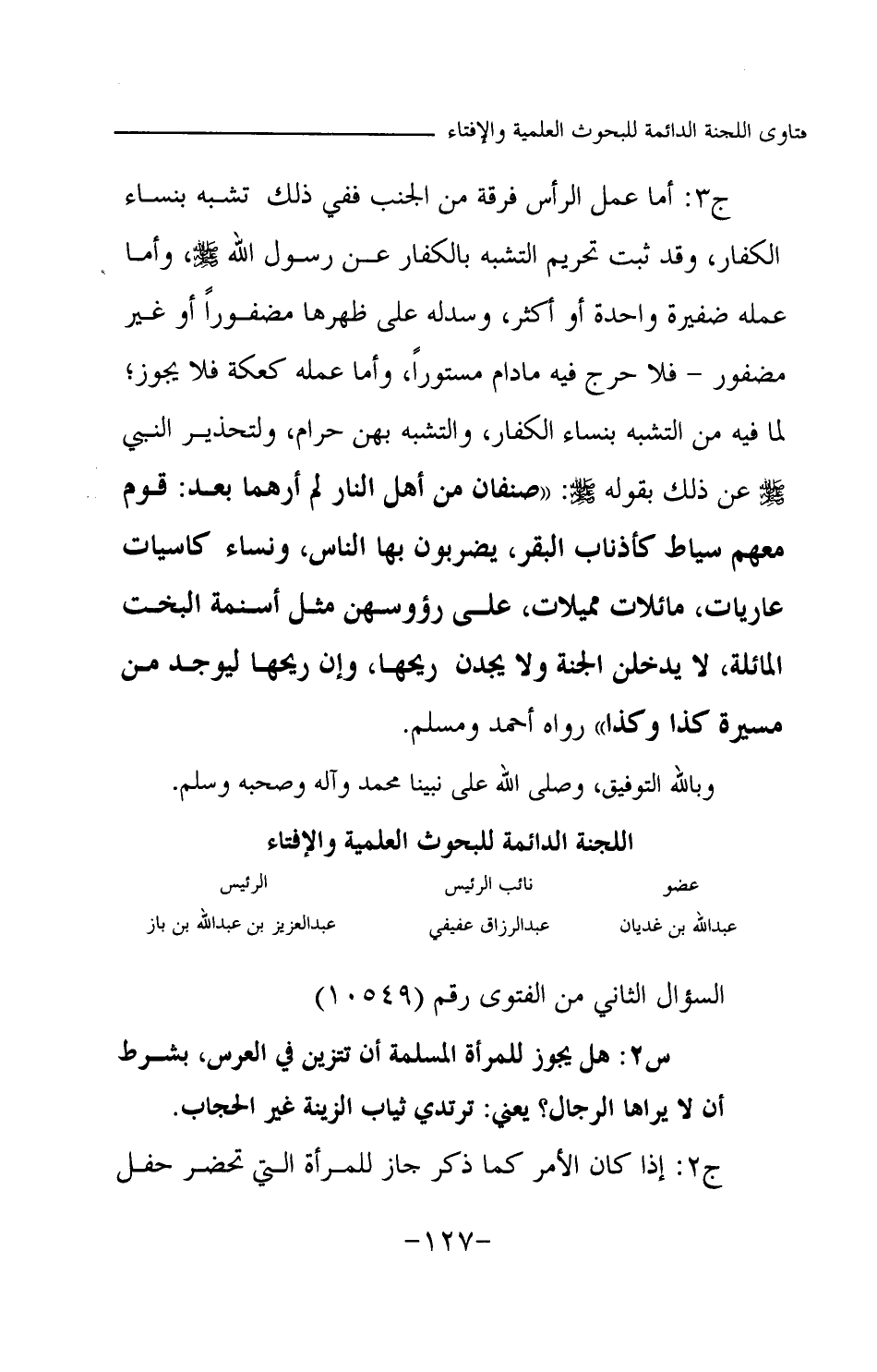 ج3: أما عمل الرأس فرقة من الجنب ففي ذلك تشبه بنساء الكفار، وقد ثبت تحريم التشبه بالكفار عن رسول الله -صلى الله عليه وسلم-، وأما عمله ضفيرة واحدة أو أكثر، وسدله على ظهرها مضفورا أو غير مضفور- فلا حرج فيه ما دام مستورا، وأما عمله كعكة فلا يجوز؛ لما فيه من التشبه بنساء الكفار، والتشبه بهن حرام، ولتحذير النبي -صلى الله عليه وسلم- عن ذلك بقوله -صلى الله عليه وسلم-: «صنفان من أهل النار لم أرهما بعد: قوم معهم سياط كأذناب البقر، يضربون بها الناس، ونساء كاسيات عاريات، مائلات مميلات، على رؤوسهن مثل أسنمة البخت المائلة، لا يدخلن الجنة ولا يجدن ريحها، وإن ريحها ليوجد من مسيرة كذا وكذا (¬1) » رواه أحمد ومسلم. وبالله التوفيق، وصلى الله على نبينا محمد وآله وصحبه وسلم.