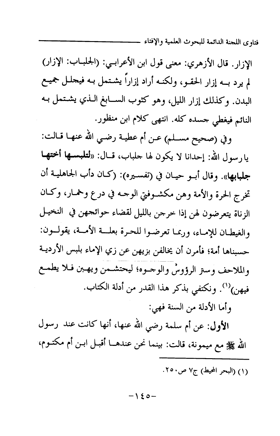 قال الأزهري معنى قول ابن الأعرابي (الجلباب: الإزار) لم يرد به إزار الحقو، ولكنه أراد إزارا يشتمل به فيجلل جميع البدن. وكذلك إزار الليل، وهو كثوب السابغ الذي يشتمل به النائم فيغطي جسده كله. انتهى كلام ابن منظور. وفي (صحيح مسلم) عن أم عطية -رضي الله عنها- قالت: «يا رسول الله: إحدانا لا يكون لها جلباب، قال: لتلبسها أختها جلبابها (¬1) » وقال أبو حيان في (تفسيره) : (كان دأب الجاهلية أن تخرج الحرة والأمة وهن مكشوفتي الوجه في درع وخمار، وكان الزناة يتعرضون لهن إذا خرجن بالليل لقضاء حوائجهن في النخيل والغيطان للإماء، وربما تعرضوا للحرة بعلة الأمة، يقولون: حسبناها أمة؛ فأمرن أن يخالفن بزيهن عن زي الإماء بلبس الأردية والملاحف وستر الرؤوس والوجوه، ليحتشمن ويهبن فلا يطمع فيهن) (¬2) ونكتفي بذكر هذا القدر من أدلة الكتاب. وأما الأدلة من السنة فهي: الأول: عن أم سلمة -رضي الله عنها- «أنها كانت عند رسول الله -صلى الله عليه وسلم- مع ميمونة، قالت: بينما نحن عندها أقبل ابن أم مكتوم،