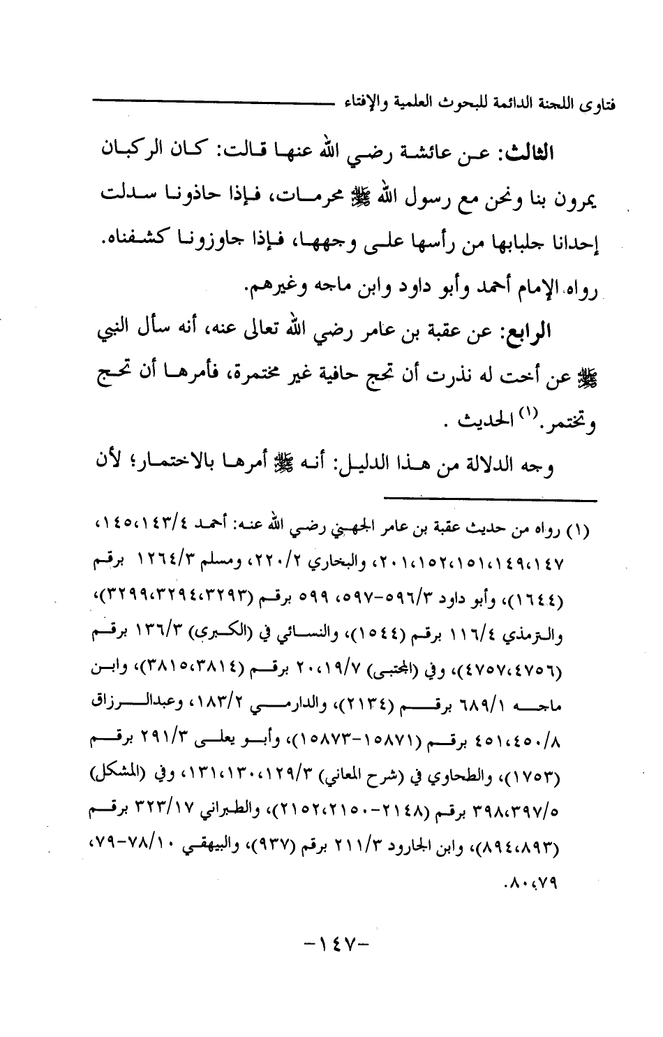 الثالث: عن عائشة -رضي الله عنها- قالت: «كان الركبان يمرون بنا ونحن مع رسول الله -صلى الله عليه وسلم- محرمات، فإذا حاذونا سدلت إحدانا جلبابها من رأسها على وجهها، فإذا جاوزونا كشفناه (¬1) » رواه الإمام أحمد وأبو داود وابن ماجه وغيرهم. الرابع: عن عقبة بن عامر -رضي الله تعالى عنه- «أنه سأل النبي -صلى الله عليه وسلم- عن أخت له نذرت أن تحج حافية غير مختمرة، فأمرها أن تحج وتختمر (¬2) » الحديث. وجه الدلالة من هذا الدليل: أنه -صلى الله عليه وسلم- أمرها بالاختمار؛ لأن