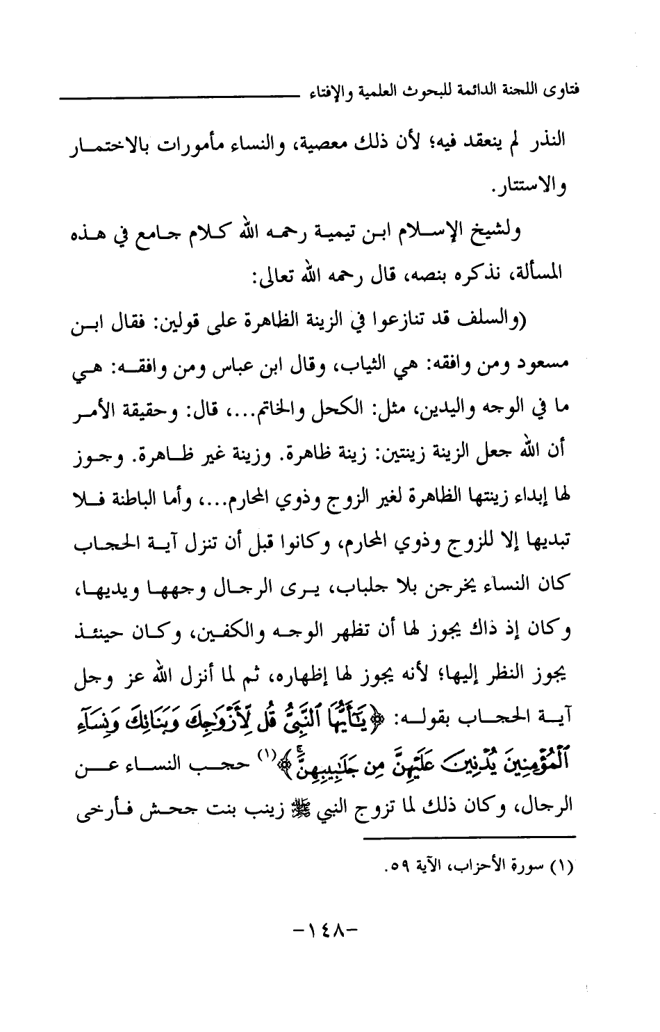 النذر لم ينعقد فيه؛ لأن ذلك معصية، والنساء مأمورات بالاختمار والاستتار. ولشيخ الإسلام ابن تيمية -رحمه الله- كلام جامع في هذه المسألة، نذكره بنصه، قال رحمه الله تعالى: (والسلف قد تنازعوا في الزينة الظاهرة على قولين: فقال ابن مسعود ومن وافقه: هي الثياب، وقال ابن عباس ومن وافقه: هي ما في الوجه واليدين، مثل: الكحل والخاتم ... ، قال: وحقيقة الأمر أن الله جعل الزينة زينتين: زينة ظاهرة. وزينة غير ظاهرة. وجوز لها إبداء زينتها الظاهرة لغير الزوج وذوي المحارم ... ، وأما الباطنة فلا تبديها إلا للزوج وذوي المحارم، وكانوا قبل أن تنزل آية الحجاب كان النساء يخرجن بلا جلباب، يرى الرجال وجهها ويديها، وكان إذ ذاك يجوز لها أن تظهر الوجه والكفين، وكان حينئذ يجوز النظر إليها؛ لأنه يجوز لها إظهاره، ثم لما أنزل الله -عز وجل- آية الحجاب بقوله: {يَا أَيُّهَا النَّبِيُّ قُلْ لِأَزْوَاجِكَ وَبَنَاتِكَ وَنِسَاءِ الْمُؤْمِنِينَ يُدْنِينَ عَلَيْهِنَّ مِنْ جَلَابِيبِهِنَّ} (¬1) حجب النساء عن الرجال، وكان ذلك لما تزوج النبي -صلى الله عليه وسلم- زينب بنت جحش فأرخى