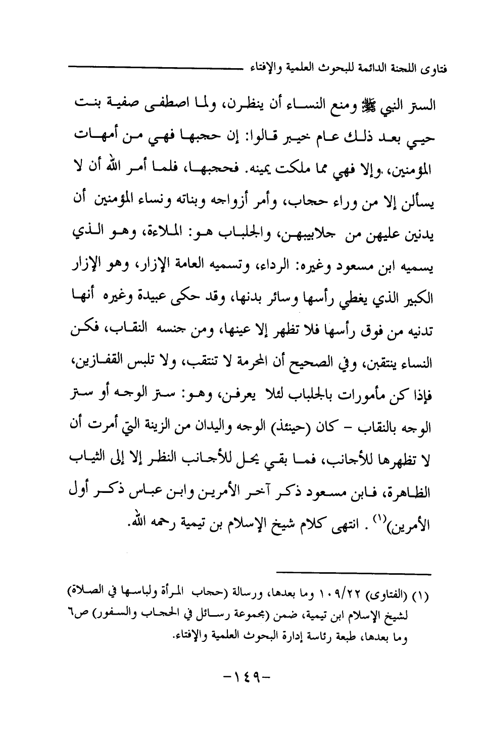 الستر النبي -صلى الله عليه وسلم- ومنع النساء أن ينظرن، ولما اصطفى صفية بنت حيي بعد ذلك عام خيبر قالوا: إن حجبها فهي من أمهات المؤمنين، وإلا فهي مما ملكت يمينه. فحجبها، فلما أمر الله أن لا يسألن إلا من وراء حجاب، وأمر أزواجه وبناته ونساء المؤمنين أن يدنين عليهن من جلابيبهن، والجلباب هو: الملاءة، وهو الذي يسميه ابن مسعود وغيره: الرداء، وتسميه العامة الإزار، وهو الإزار الكبير الذي يغطي رأسها وسائر بدنها، وقد حكى عبيدة وغيره أنها تدنيه من فوق رأسها فلا تظهر إلا عينها، ومن جنسه النقاب، فكن النساء ينتقبن، وفي الصحيح أن المحرمة لا تنتقب، ولا تلبس القفازين، فإذا كن مأمورات بالجلباب لئلا يعرفن، وهو: ستر الوجه أو ستر الوجه بالنقاب- كان (حينئذ) الوجه واليدان من الزينة التي أمرت أن لا تظهرها للأجانب، فما بقي يحل للأجانب النظر إلا إلى الثياب الظاهرة، فابن مسعود ذكر آخر الأمرين وابن عباس ذكر أول الأمرين) انتهى كلام شيخ الإسلام ابن تيمية رحمه الله.