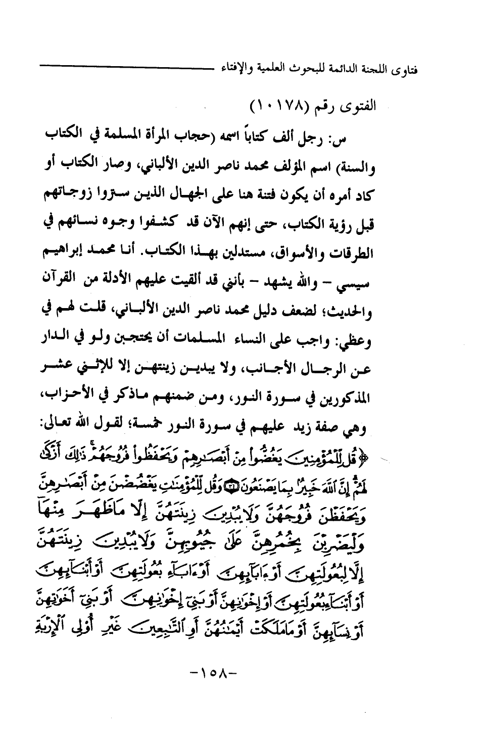 س: رجل ألف كتابا اسمه (حجاب المرأة المسلمة في الكتاب والسنة) اسم المؤلف محمد ناصر الدين الألباني وصار الكتاب أو كاد أمره أن يكون فتنة هنا على الجهال الذين ستروا زوجاتهم قبل رؤية الكتاب، حتى إنهم الآن قد كشفوا وجوه نسائهم في الطرقات والأسواق، مستدلين بهذا الكتاب. أنا محمد إبراهيم سيسي -والله يشهد- بأنني قد ألقيت عليهم الأدلة من القرآن والحديث؛ لضعف دليل محمد ناصر الدين الألباني قلت لهم في وعظي: واجب على النساء المسلمات أن يحتجبن ولو في الدار عن الرجال الأجانب، ولا يبدين زينتهن إلا للاثني عشر المذكورين في سورة النور، ومن ضمنهم ما ذكر في الأحزاب، وهي صفة زيد عليهم في سورة النور خمسة؛ لقول الله تعالى: {قُلْ لِلْمُؤْمِنِينَ يَغُضُّوا مِنْ أَبْصَارِهِمْ وَيَحْفَظُوا فُرُوجَهُمْ ذَلِكَ أَزْكَى لَهُمْ إِنَّ اللَّهَ خَبِيرٌ بِمَا يَصْنَعُونَ} (¬1) {وَقُلْ لِلْمُؤْمِنَاتِ يَغْضُضْنَ مِنْ أَبْصَارِهِنَّ وَيَحْفَظْنَ فُرُوجَهُنَّ وَلَا يُبْدِينَ زِينَتَهُنَّ إِلَّا مَا ظَهَرَ مِنْهَا وَلْيَضْرِبْنَ بِخُمُرِهِنَّ عَلَى جُيُوبِهِنَّ وَلَا يُبْدِينَ زِينَتَهُنَّ إِلَّا لِبُعُولَتِهِنَّ أَوْ آبَائِهِنَّ أَوْ آبَاءِ بُعُولَتِهِنَّ أَوْ أَبْنَائِهِنَّ أَوْ أَبْنَاءِ بُعُولَتِهِنَّ أَوْ إِخْوَانِهِنَّ أَوْ بَنِي إِخْوَانِهِنَّ أَوْ بَنِي أَخَوَاتِهِنَّ أَوْ نِسَائِهِنَّ أَوْ مَا مَلَكَتْ أَيْمَانُهُنَّ أَوِ التَّابِعِينَ غَيْرِ أُولِي الْإِرْبَةِ مِنَ الرِّجَالِ أَوِ الطِّفْلِ الَّذِينَ لَمْ يَظْهَرُوا عَلَى عَوْرَاتِ النِّسَاءِ} (¬2)