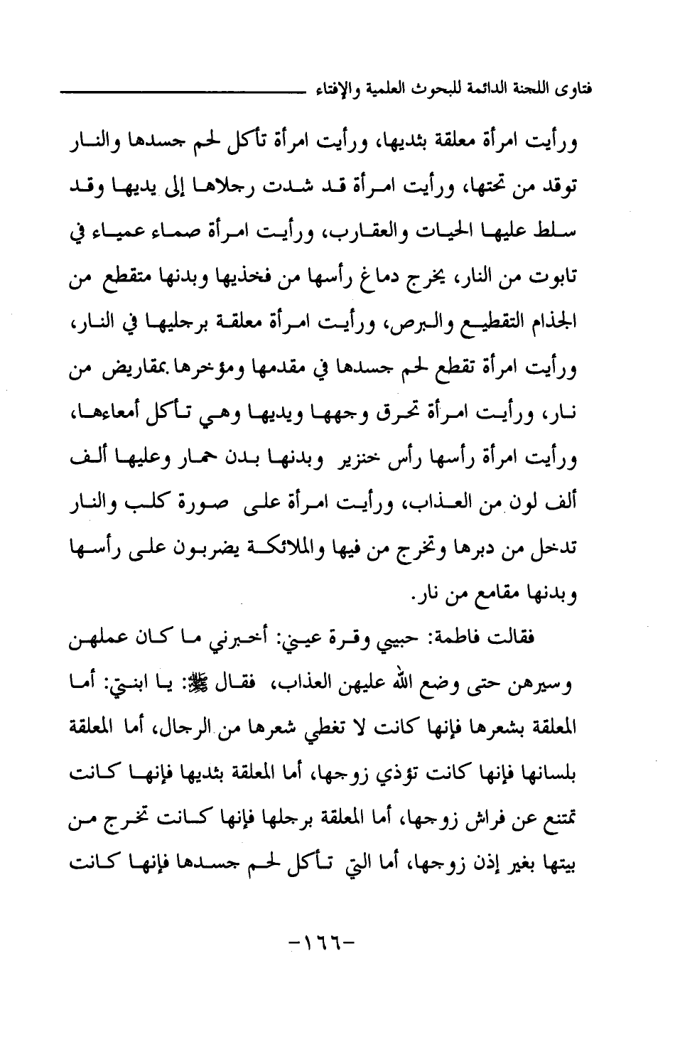 ورأيت امرأة معلقة بثديها، ورأيت امرأة تأكل لحم جسدها والنار توقد من تحتها، ورأيت امرأة قد شدت رجلاها إلى يديها وقد سلط عليها الحيات والعقارب، ورأيت امرأة صماء عمياء في تابوت من النار، يخرج دماغ رأسها من فخذيها وبدنها متقطع من الجذام التقطيع والبرص، ورأيت امرأة معلقة برجليها في النار، ورأيت امرأة تقطع لحم جسدها في مقدمها ومؤخرها بمقاريض من نار، ورأيت امرأة تحرق وجهها ويديها وهي تأكل أمعاءها، ورأيت امرأة رأسها رأس خنزير وبدنها بدن حمار وعليها ألف ألف لون من العذاب، ورأيت امرأة على صورة كلب والنار تدخل من دبرها وتخرج من فيها والملائكة يضربون على رأسها وبدنها مقامع من نار. فقالت فاطمة: حبيبي وقرة عيني: أخبرني ما كان عملهن وسيرهن حتى وضع الله عليهن العذاب، فقال -صلى الله عليه وسلم-: يا ابنتي: أما المعلقة بشعرها فإنها كانت لا تغطي شعرها من الرجال، أما المعلقة بلسانها فإنها كانت تؤذي زوجها، أما المعلقة بثديها فإنها كانت تمتنع عن فراش زوجها، أما المعلقة برجلها فإنها كانت تخرج من بيتها بغير إذن زوجها، أما التي تأكل لحم جسدها فانها كانت