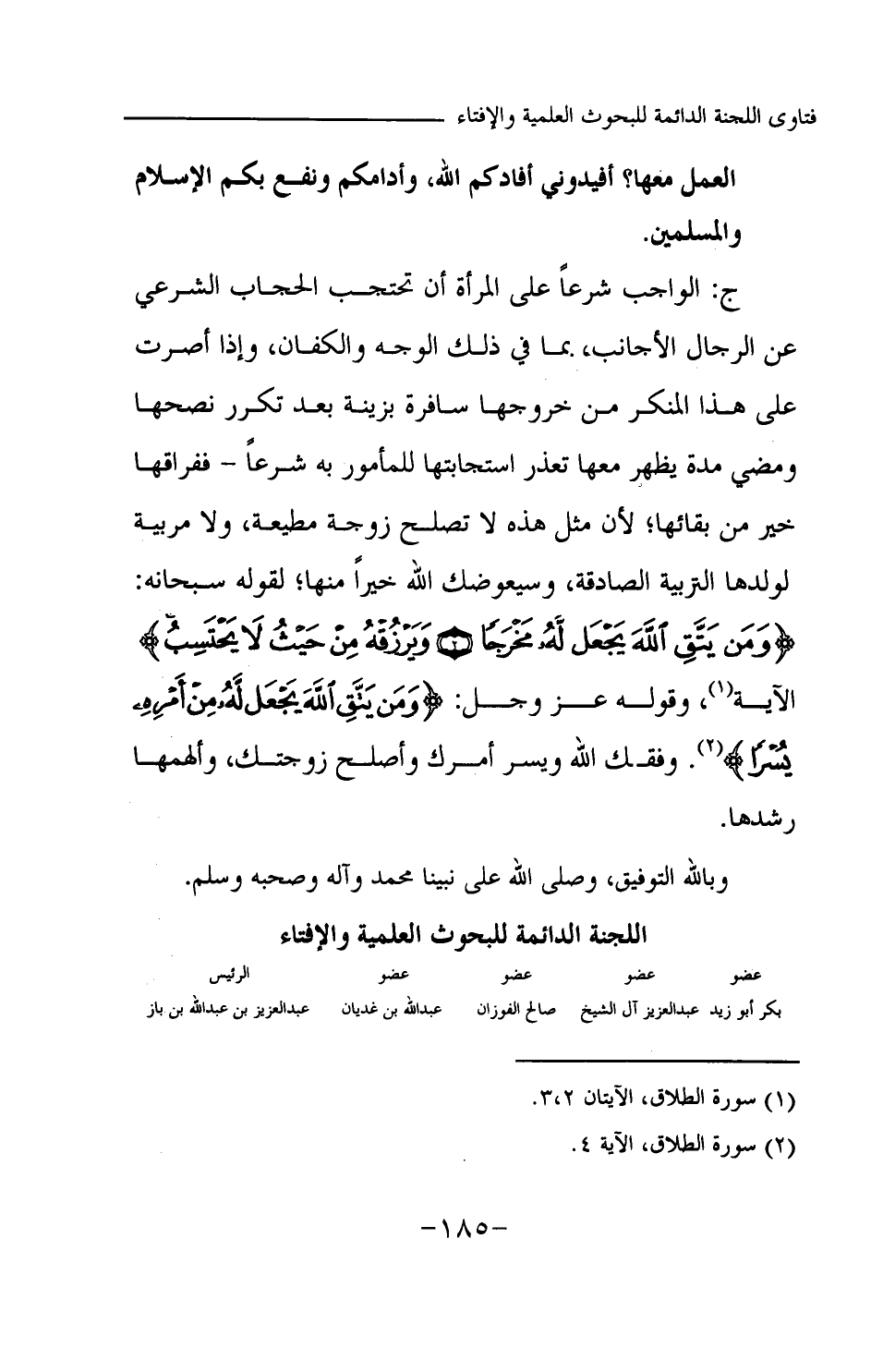 ج: الواجب شرعا على المرأة أن تحتجب الحجاب الشرعي عن الرجال الأجانب، بما في ذلك الوجه والكفان، وإذا أصرت على هذا المنكر من خروجها سافرة بزينة بعد تكرر نصحها ومضي مدة يظهر معها تعذر استجابتها للمأمور به شرعا- ففراقها خير من بقائها، لأن مثل هذه لا تصلح زوجة مطيعة، ولا مربية لولدها التربية الصادقة، وسيعوضك الله خيرا منها، لقوله سبحانه: {وَمَنْ يَتَّقِ اللَّهَ يَجْعَلْ لَهُ مَخْرَجًا} (¬1) {وَيَرْزُقْهُ مِنْ حَيْثُ لَا يَحْتَسِبُ} (¬2) الآية، وقوله عز وجل: {وَمَنْ يَتَّقِ اللَّهَ يَجْعَلْ لَهُ مِنْ أَمْرِهِ يُسْرًا} (¬3) وفقك الله ويسر أمرك وأصلح زوجتك، وألهمها رشدها. وبالله التوفيق، وصلى الله على نبينا محمد وآله وصحبه وسلم.