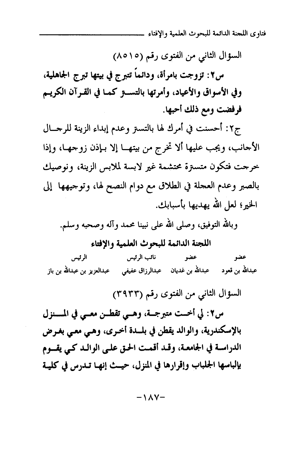 س2: تزوجت بامرأة، ودائما تتبرج في بيتها تبرج الجاهلية، وفي الأسواق والأعياد، وأمرتها بالتستر كما في القرآن الكريم فرفضت ومع ذلك أحبها.