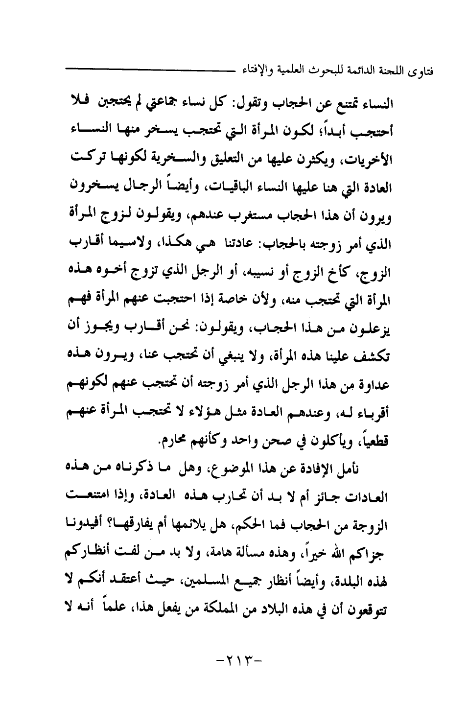 النساء تمتنع عن الحجاب وتقول: كل نساء جماعتي لم يحتجبن فلا أحتجب أبدا؛ لكون المرأة التي تحتجب يسخر منها النساء الأخريات، ويكثرن عليها من التعليق والسخرية لكونها تركت العادة التي هنا عليها النساء الباقيات، وأيضا الرجال يسخرون ويرون أن هذا الحجاب مستغرب عندهم، ويقولون لزوج المرأة الذي أمر زوجته بالحجاب: عادتنا هي هكذا، ولا سيما أقارب الزوج، كأخ الزوج أو نسيبه، أو الرجل الذي تزوج أخوه هذه المرأة التي تحتجب منه، ولأن خاصة إذا احتجبت عنهم المرأة فهم يزعلون من هذا الحجاب، ويقولون: نحن أقارب ويجوز أن تكشف علينا هذه المرأة، ولا ينبغي أن تحتجب عنا، ويرون هذه عداوة من هذا الرجل الذي أمر زوجته أن تحتجب عنهم لكونهم أقرباء له، وعندهم العادة مثل هؤلاء لا تحتجب المرأة عنهم قطعيا، ويأكلون في صحن واحد وكأنهم محارم. نأمل الإفادة عن هذا الموضوع، وهل ما ذكرناه من هذه العادات جائز أم لا بد أن تحارب هذه العادة، وإذا امتنعت الزوجة من الحجاب فما الحكم، هل يلازمها أم يفارقها؟ أفيدونا جزاكم الله خيرا، وهذه مسألة هامة، ولا بد من لفت أنظاركم لهذه البلدة، وأيضا أنظار جميع المسلمين، حيث أعتقد أنكم لا تتوقعون أن في هذه البلاد من المملكة من يفعل هذا، علما أنه لا