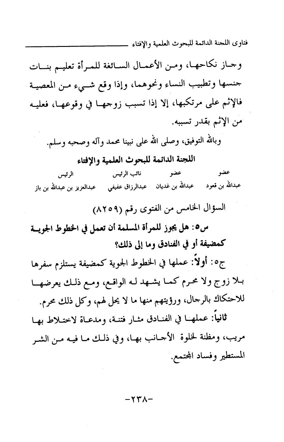ج5: أولا: عملها في الخطوط الجوية كمضيفة يستلزم سفرها بلا زوج ولا محرم كما يشهد له الواقع، ومع ذلك يعرضها للاحتكاك بالرجال، ورؤيتهم منها ما لا يحل لهم، وكل ذلك محرم. ثانيا: عملها في الفنادق مثار فتنة، ومدعاة لاختلاط بها مريب، ومظنة لخلوة الأجانب بها، وفي ذلك ما فيه من الشر المستطير وفساد المجتمع.