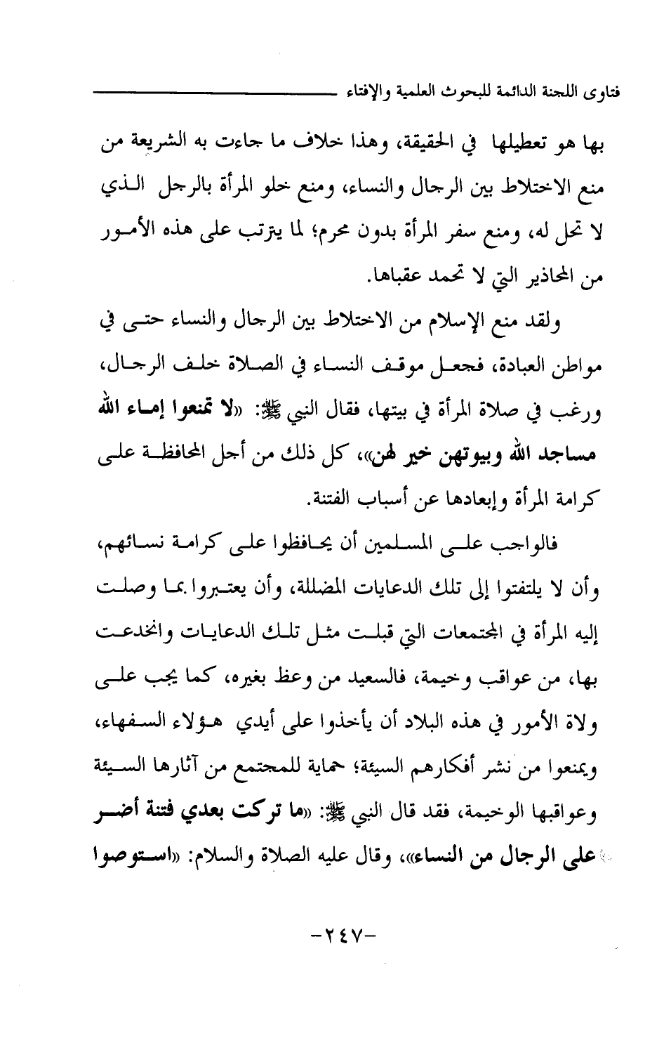 بها هو تعطيلها في الحقيقة، وهذا خلاف ما جاءت به الشريعة من منع الاختلاط بين الرجال والنساء، ومنع خلوة المرأة بالرجل الذي لا تحل له، ومنع سفر المرأة بدون محرم، لما يترتب على هذه الأمور من المحاذير التي لا تحمد عقباها. ولقد منع الإسلام من الاختلاط بين الرجال والنساء حتى في مواطن العبادة، فجعل موقف النساء في الصلاة خلف الرجال، ورغب في صلاة المرأة في بيتها، فقال النبي -صلى الله عليه وسلم-: «لا تمنعوا إماء الله مساجد الله وبيوتهن خير لهن (¬1) » كل ذلك من أجل المحافظة على كرامة المرأة وإبعادها عن أسباب الفتنة. فالواجب على المسلمين أن يحافظوا على كرامة نسائهم، وأن لا يلتفتوا إلى تلك الدعايات المضللة، وأن يعتبروا بما وصلت إليه المرأة في المجتمعات التي قبلت مثل تلك الدعايات وانخدعت بها، من عواقب وخيمة، فالسعيد من وعظ بغيره، كما يجب على ولاة الأمور في هذه البلاد أن يأخذوا على أيدي هؤلاء السفهاء، ويمنعوا من نشر أفكارهم السيئة؛ حماية للمجتمع من آثارها السيئة وعواقبها الوخيمة، فقد قال النبي -صلى الله عليه وسلم-: «ما تركت بعدي فتنة أضر على الرجال من النساء (¬2) » وقال عليه الصلاة والسلام: «استوصوا