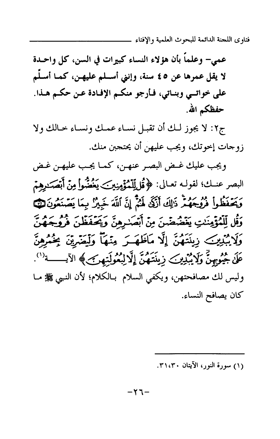 ج2: لا يجوز لك أن تقبل نساء عمك ونساء خالك ولا زوجات إخوتك، ويجب عليهن أن يحتجبن منك. ويجب عليك غض البصر عنهن، كما يجب عليهن غض البصر عنك؛ لقوله تعالى: {قُلْ لِلْمُؤْمِنِينَ يَغُضُّوا مِنْ أَبْصَارِهِمْ وَيَحْفَظُوا فُرُوجَهُمْ ذَلِكَ أَزْكَى لَهُمْ إِنَّ اللَّهَ خَبِيرٌ بِمَا يَصْنَعُونَ} (¬1) {وَقُلْ لِلْمُؤْمِنَاتِ يَغْضُضْنَ مِنْ أَبْصَارِهِنَّ وَيَحْفَظْنَ فُرُوجَهُنَّ وَلَا يُبْدِينَ زِينَتَهُنَّ إِلَّا مَا ظَهَرَ مِنْهَا وَلْيَضْرِبْنَ بِخُمُرِهِنَّ عَلَى جُيُوبِهِنَّ وَلَا يُبْدِينَ زِينَتَهُنَّ إِلَّا لِبُعُولَتِهِنَّ} (¬2) الآية. وليس لك مصافحتهن، ويكفي السلام بالكلام؛ لأن النبي -صلى الله عليه وسلم- ما كان يصافح النساء.