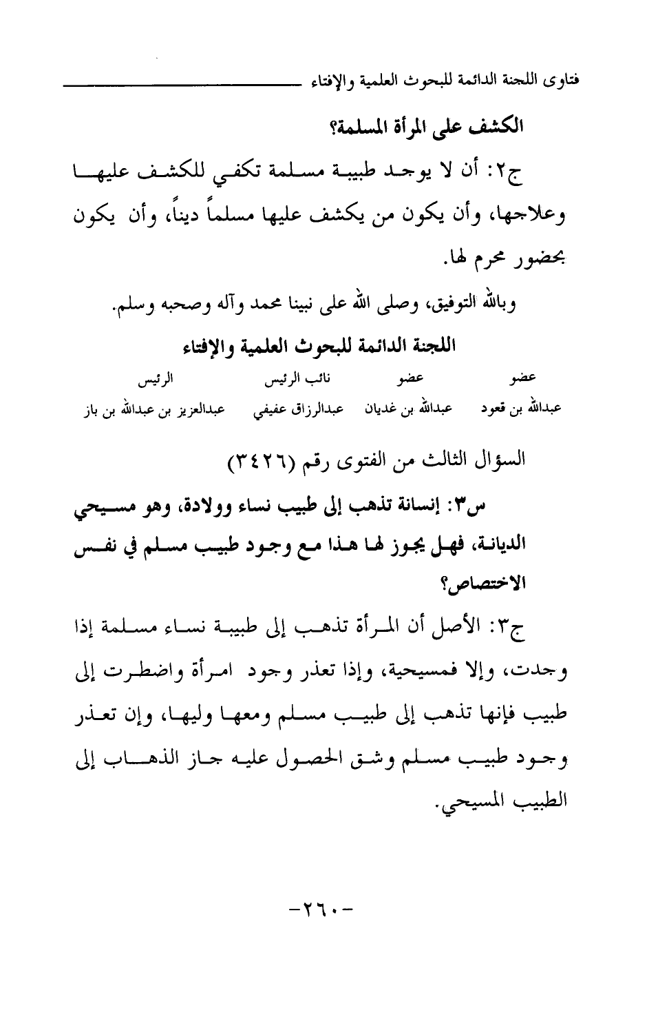 ج3: الأصل أن المرأة تذهب إلى طبيبة نساء مسلمة إذا وجدت، وإلا فمسيحية، وإذا تعذر وجود امرأة واضطرت إلى طبيب فإنها تذهب إلى طبيب مسلم ومعها وليها، وإن تعذر وجود طبيب مسلم وشق الحصول عليه جاز الذهاب إلى الطبيب المسيحي.