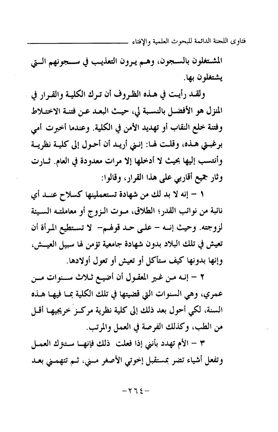 المشتغلون بالسجون، وهم يرون التعذيب في سجونهم التي يشتغلون بها. ولقد رأيت في هذه الظروف أن ترك الكلية والقرار في المنزل هو الأفضل بالنسبة لي، حيث البعد عن فتنة الاختلاط وفتنة خلع النقاب أو تهديد الأمن في الكلية. وعندما أخبرت أمي برغبتي هذه، وقلت لها: إنني أريد أن أحول إلى كلية نظرية وأنتسب إليها بحيث لا أدخلها إلا مرات معدودة في العام ثارت وثار جميع أقاربي على هذا القرار، وقالوا: 1- إنه لا بد لك من شهادة تستعملينها كسلاح عند أي نائبة من نوائب القدر، الطلاق، موت الزوج أو معاملته السيئة لزوجته. وحيث إنه- على حد قولهم- لا تستطيع المرأة أن تعيش في تلك البلاد بدون شهادة جامعية تؤمن لها سبيل العيش، وإنها بدونها كيف ستأكل أو تعيش أو تعول أولادها. 2- إنه من غير المعقول أن أضيع ثلاث سنوات من عمري، وهي السنوات التي قضيتها في تلك الكلية بما فيها هذه السنة، لكي أحول بعد ذلك إلى كلية نظرية مركز خريجيها أقل من الطب، وكذلك الفرصة في العمل والمرتب. 3- الأم تهدد بأنني إذا فعلت ذلك فإنها ستترك العمل وتفعل أشياء تضر بمستقبل أخوتي الأصغر مني، ثم تتهمني بعد