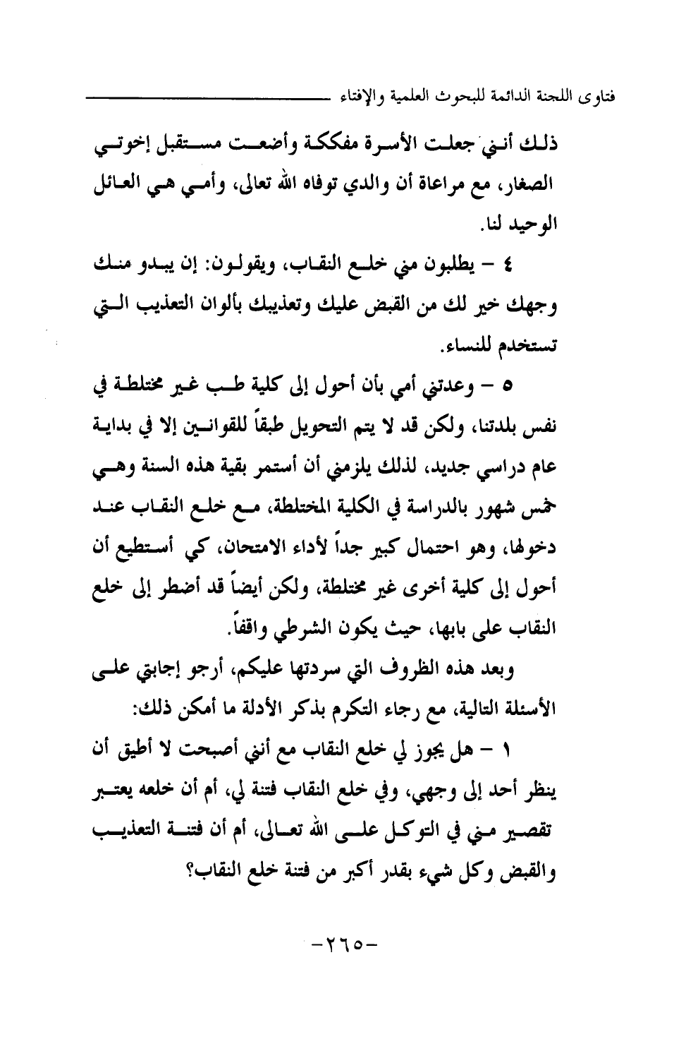 ذلك أنني جعلت الأسرة مفككة وأضعت مستقبل أخوتي الصغار، مع مراعاة أن والدي توفاه الله تعالى، وأمي هي العائل الوحيد لنا. 4- يطلبون مني خلع النقاب، ويقولون: إن يبدو منك وجهك خير لك من القبض عليك وتعذيبك بألوان التعذيب التي تستخدم للنساء. 5- وعدتني أمي بأن أحول إلى كلية طب غير مختلطة في نفس بلدتنا، ولكن قد لا يتم التحويل طبقا للقوانين إلا في بداية عام دراسي جديد؛ لذلك يلزمني أن أستمر بقية هذه السنة وهي خمس شهور بالدراسة في الكلية المختلطة، مع خلع النقاب عند دخولها، وهو احتمال كبير جدا لأداء الامتحان، كي أستطيع أن أحول إلى كلية أخرى غير مختلطة، ولكن أيضا قد أضطر إلى خلع النقاب على بابها، حيث يكون الشرطي واقفا. وبعد هذه الظروف التي سردتها عليكم، أرجو إجابتي على الأسئلة التالية، مع رجاء التكرم بذكر الأدلة ما أمكن ذلك: 1- هل يجوز لي خلع النقاب مع أنني أصبحت لا أطيق أن ينظر أحد إلى وجهي، وفي خلع النقاب فتنة لي، أم أن خلعه يعتبر تقصير مني في التوكل على الله تعالى، أم أن فتنة التعذيب والقبض وكل شيء بقدر أكبر من فتنة خلع النقاب؟