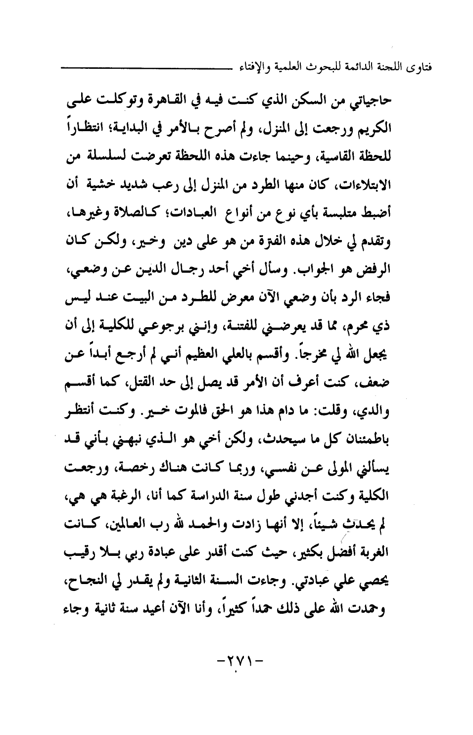 حاجياتي من السكن الذي كنت فيه في القاهرة وتوكلت على الكريم ورجعت إلى المنزل، ولم أصرح بالأمر في البداية؛ انتظارا للحظة القاسية. وحينما جاءت هذه اللحظة تعرضت لسلسلة من الابتلاءات، كان منها الطرد من المنزل إلى رعب شديد خشية أن أضبط متلبسة بأي نوع من أنواع العبادات؟ كالصلاة وغيرها، وتقدم لي خلال هذه الفترة من هو على دين وخير، ولكن كان الرفض هو الجواب. وسأل أخي أحد رجال الدين عن وضعي، فجاء الرد بأن وضعي الآن معرض للطرد من البيت عند ليس ذي محرم، مما قد يعرضني للفتنة، وإنني برجوعي للكلية إلى أن يجعل الله لي مخرجا. وأقسم بالعلي العظيم أني لم أرجع أبدا عن ضعف، كنت أعرف أن الأمر قد يصل إلى حد القتل، كما أقسم والدي، وقلت: ما دام هذا هو الحق فالموت خير وكنت أنتظر باطمئنان كل ما سيحدث، ولكن أخي هو الذي نبهني بأني قد يسألني المولى عن نفسي، وربما كانت هناك رخصة، ورجعت الكلية وكنت أجدني طول سنة الدراسة كما أنا، الرغبة هي هي، لم يحدث شيء، إلا أنها زادت والحمد لله رب العالمين. كانت الغربة أفضل بكثير، حيث كنت أقدر على عبادة ربي بلا رقيب يحصي علي عبادتي. وجاءت السنة الثانية ولم يقدر لي النجاح، وحمدت الله على ذلك حمدا كثيرا، وأنا الآن أعيد سنة ثانية وجاء